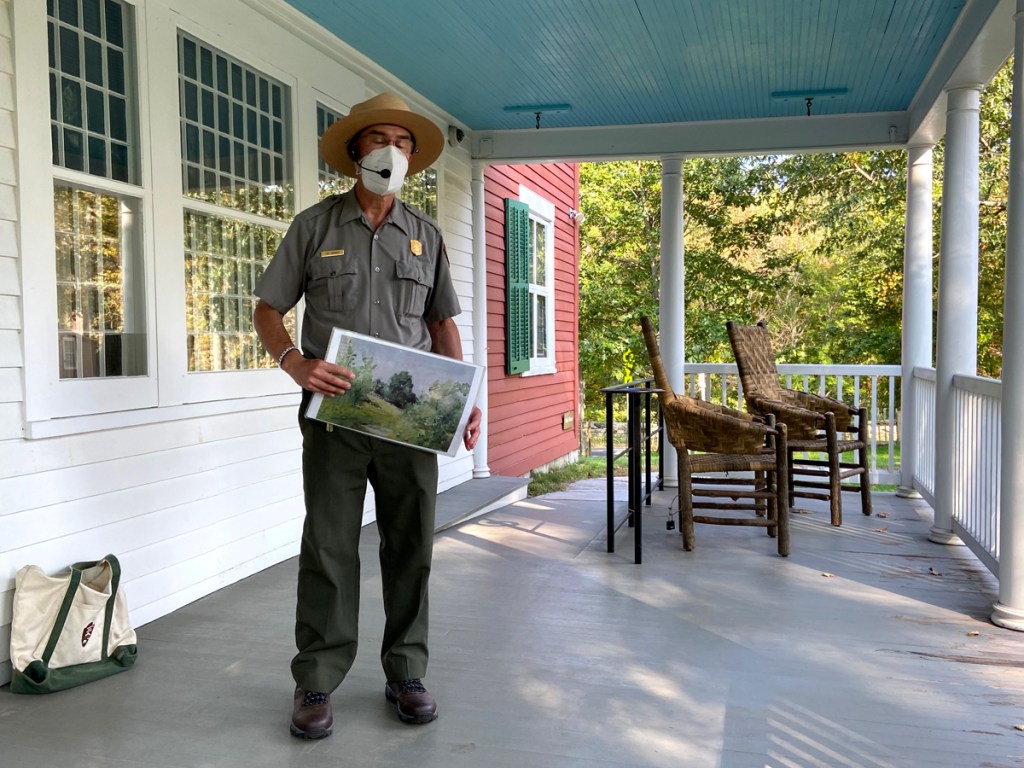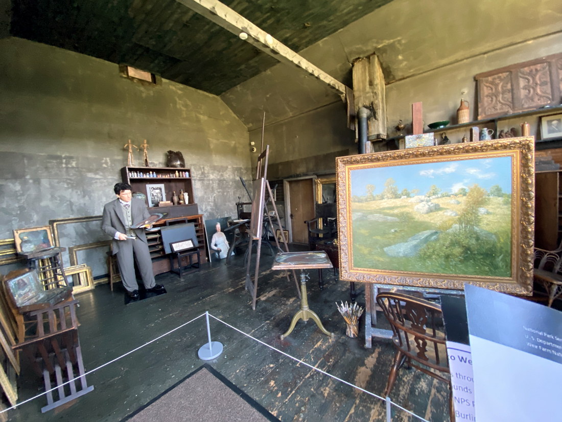 Tom was great. After we looked at the front room, we walked around back to Weir’s studio. Essentially as it was when he last walked out (he died in 1919). From the park’s website – “After Weir’s death, the studio was primarily used for storage. The Weir Studio has been restored to circa-1915 and is historically furnished. Weir’s paintbrushes, pallets, pigments, and paint boxes have been preserved and are on view inside the studio.” The painting is a reproduction of the original hanging at the Smithsonian.