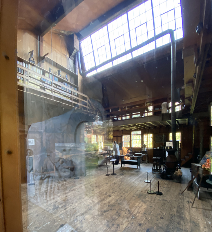 Next door is Young’s studio. “Sculptor Mahonri Mackintosh Young married Dorothy Weir Young in 1931, and moved to the Weir’s family farm, building his own studio built in 1932. Here Young worked on several masterpieces, including his largest commission, a monument entitled “This Is the Place.“ Young died on November 2, 1957. As an auto mechanic at the Gulf station down the hill in Branchville, my Dad would pick up Mahonri’s car for repairs. I vaguely remember looking into the studio once. For COVID they put up Plexiglas so you could at least peer in.