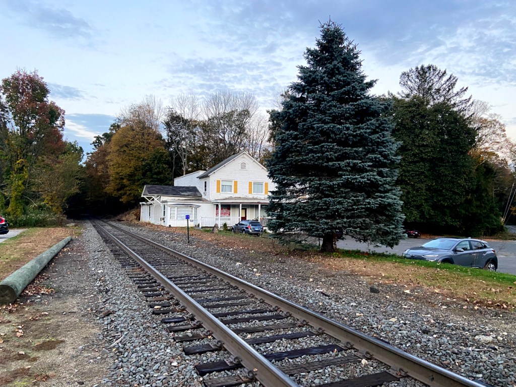 then I headed off the hill, north a tad on my favorite US Route 7 into Ridgefield, and checked into a motel I remember from the 50s. Half the price of anything else in the area, and I now know why. But onto exploring, and West Redding to find the country store that may have been the start of my fascination with the old emporiums. About the only change is that the train station is now a tad south with a raised platform, and not at the old general store in the left image.