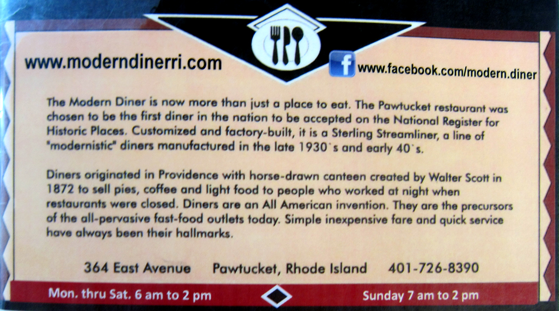 finishing up around noon I asked where to eat in the area, and was provided a list of “Lunch and Diner Options in Nearby Pawtucket and Central Falls, RI.” One jumped out as a “must do.” And, that winner was – THE MODERN DINER