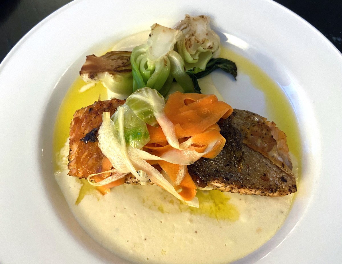 Arriving back at the Mount Washington I got freshened up, and planted myself in my favorite public space. My son, David, was due in from Boston to join me along with friends, Tara and Bob, for dinner. When I first planned this adventure and told David he exclaimed, “I can join you for dinner, and then go hiking on Saturday.” Many mountain hikes he has done this winter until three weeks ago coming down a NH mountain he broke an ankle – end of hiking for this winter. But he said he would still love to come and have dinner and hang out on Saturday. Unfortunately the rest of his family could not make it. He arrived, and we all had a grand time and dinner (albeit without breads or rolls). Below is my beet salad and salmon.