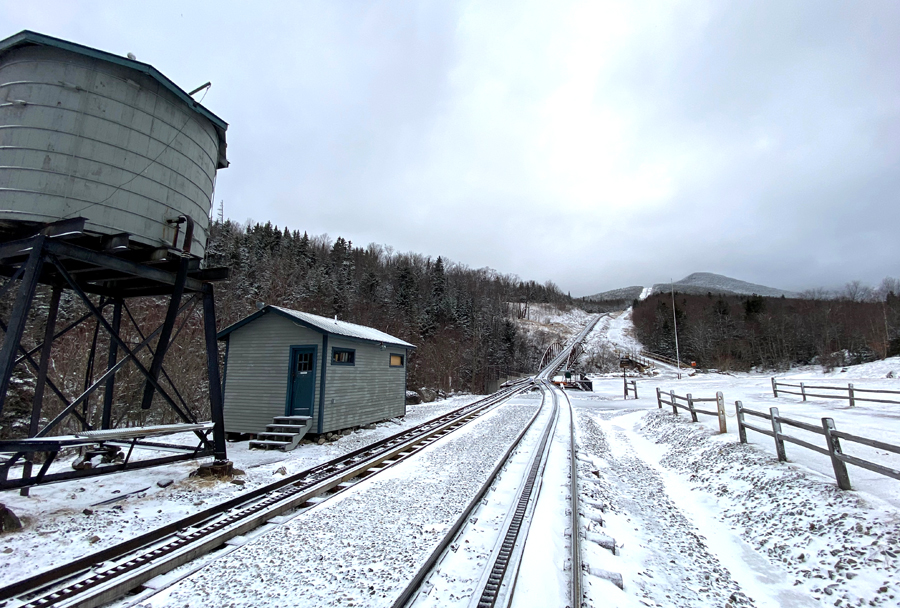 yes, the open spot below on the right below the ski area is the Mount Washington Hotel. The road from Route 302 to the Cog’s base station is six miles. In the center you see the water tank that the steam locomotives top off from to make their runs.