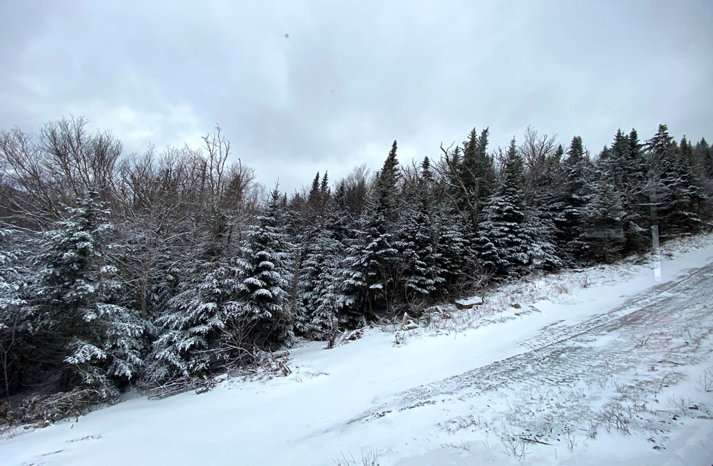 the trees to my left below – and later you will see the trees on the other side of the route that are covered with ices crystals from the wind blowing towards them.