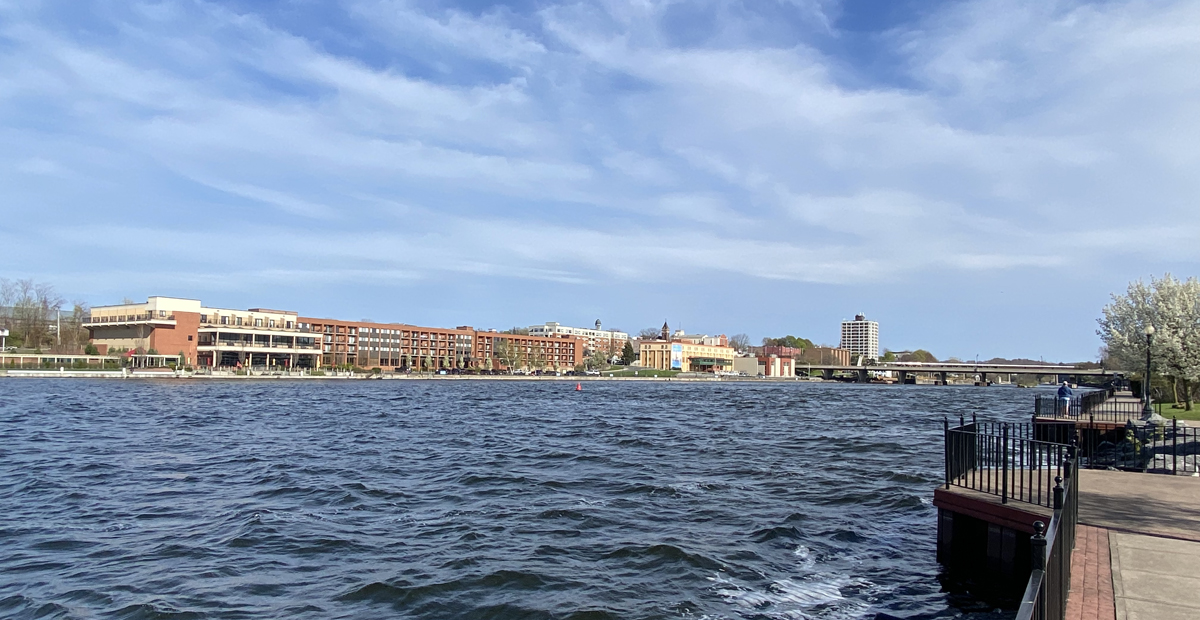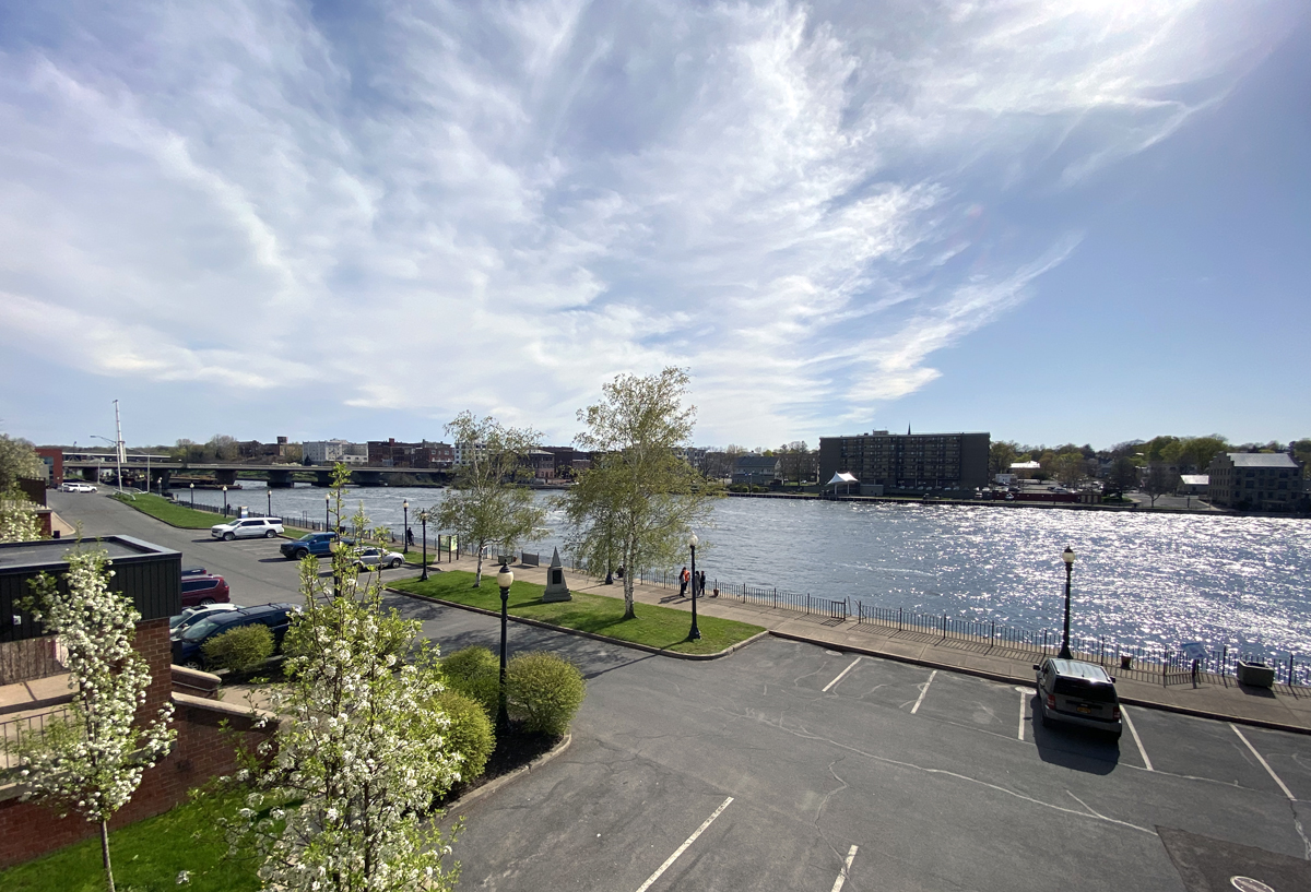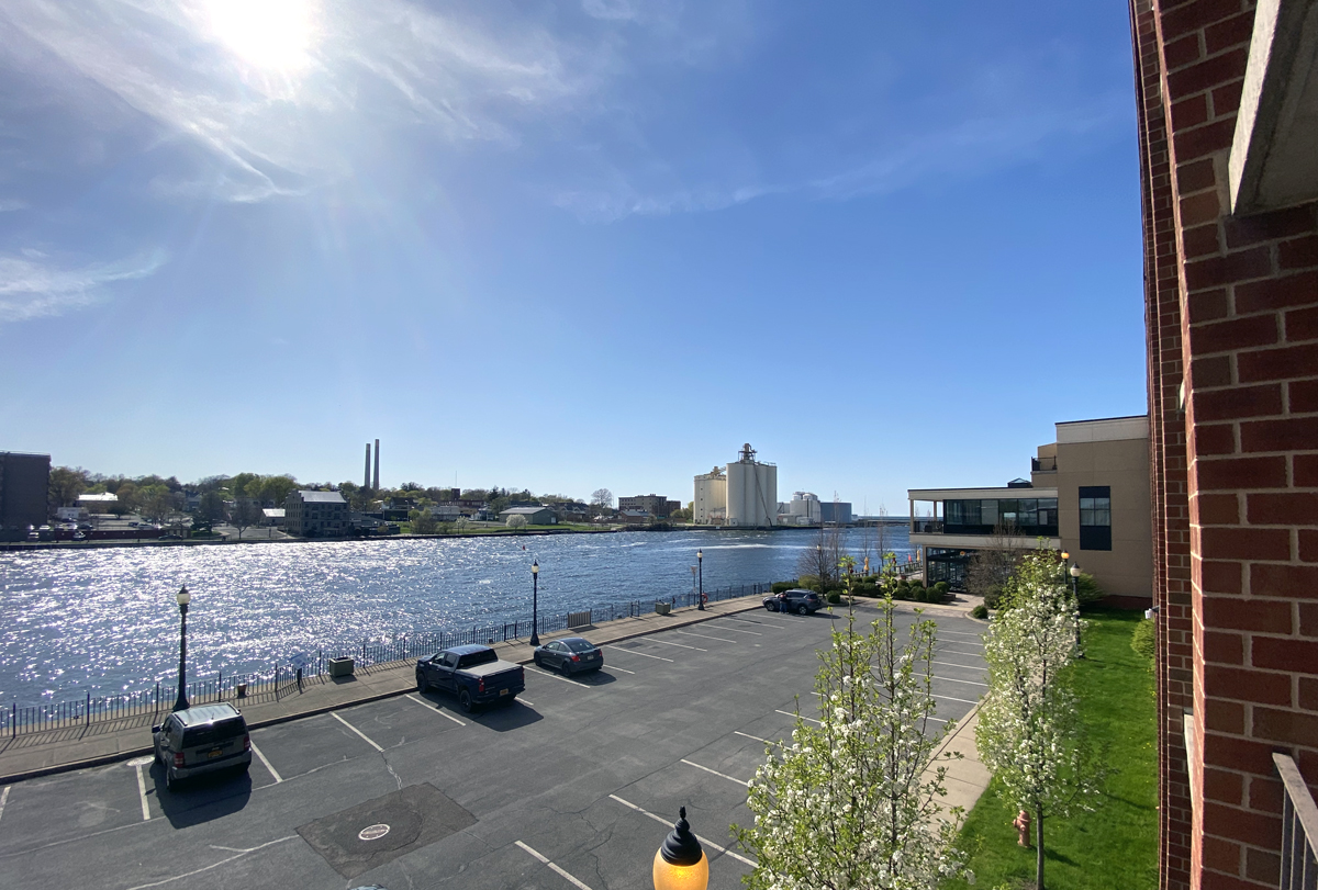 I then back roaded on Routes 69 and 13 (along the NY Revolutionary Byway) to Port Ontario on the lake. Remote Oswego County that I have now been in. Then I followed the NY Seaway Trail west. Even though so labeled on the NY State maps there is nothing special about the NY State byways – little information on what to see as to why you should be there. Arriving in Oswego (say it twice or three times fast), a block of rooms for the society was in the Best Western Plus Hotel right on the river (not my usual “home away from home”). But, actually a very nice and spacious room with a sitting area and couch (better than what I had last month at the Mount Washington Hotel for almost three times the price) — but, the view from my balcony – right side image looking to Lake Ontario.