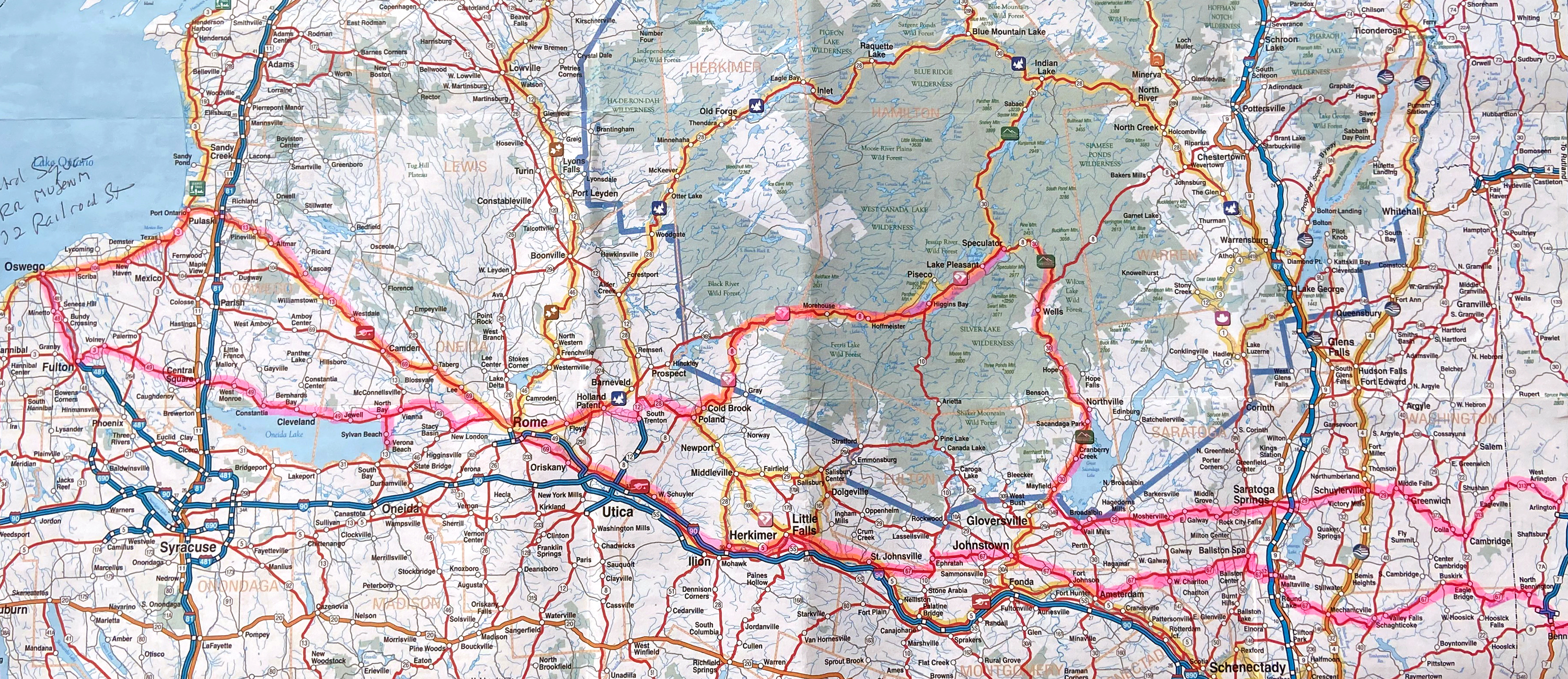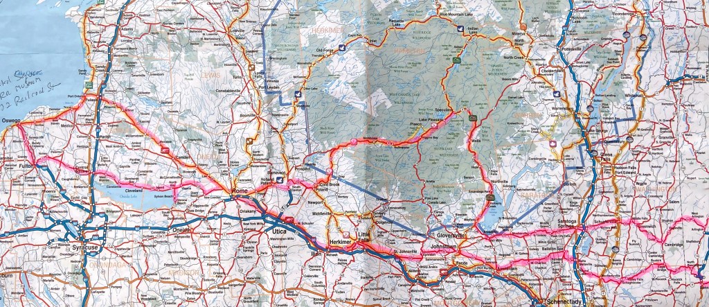 How do you get to Oswego on Lake Ontario, four and 1/2 hours away per google? Back roads, of course, with no tolls and explorations encompassing over nine hours instead. Below is a map (that you can click for full screen) to give you the routes I took west, and then back east, which I will relate in Part II of this trip report.