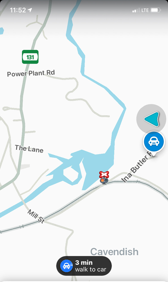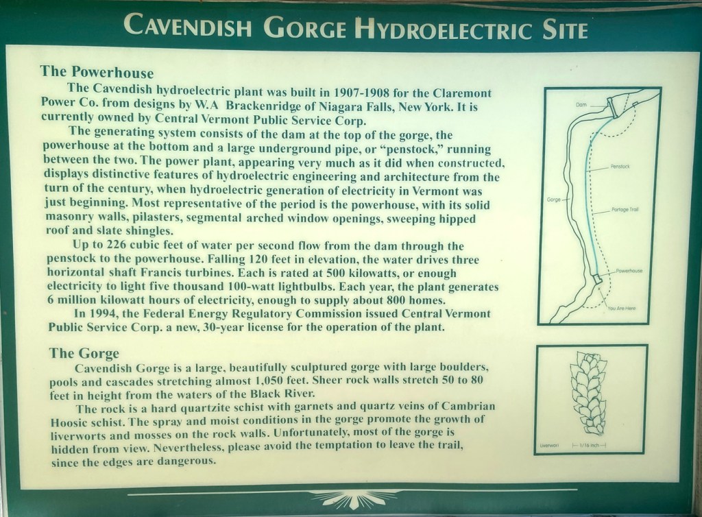 from my old “paper maps” I had a vague idea where Cavendish Gorge was – you probably have not heard of it, so I needed to find it and share. To be safe, I stopped on 131 to ask a fellow painting a white fence for help (he was not Tom Sawyer). He said yes, turn just up in Cavendish at the old three story brick factory, cross the little bridge, go under the smaller railroad underpass and turn left and look for the trail. After my second turn I asked a couple walking on the road who said, “yes, turn in 300 yards, find the snowmobile trail and you will be fine. I did not like the first turn I saw, passed it, but found a likely spot, and started hiking. Watching out for bears in the Hawks Mountain Forest Preserve, I finally decided that I best turn around, just as I did a few weeks ago not finding an abandoned railroad tunnel. You can see that WAZE knew where I was, off in the woods. Walking then down the other sharp drive I found the blocked off trail with a sign which said – “go to Power Plant Road to the Cavendish Gorge Recreation Area.” I did so. Lovely area, not as wooded so easier to spot bear. Click the image below for easier reading.