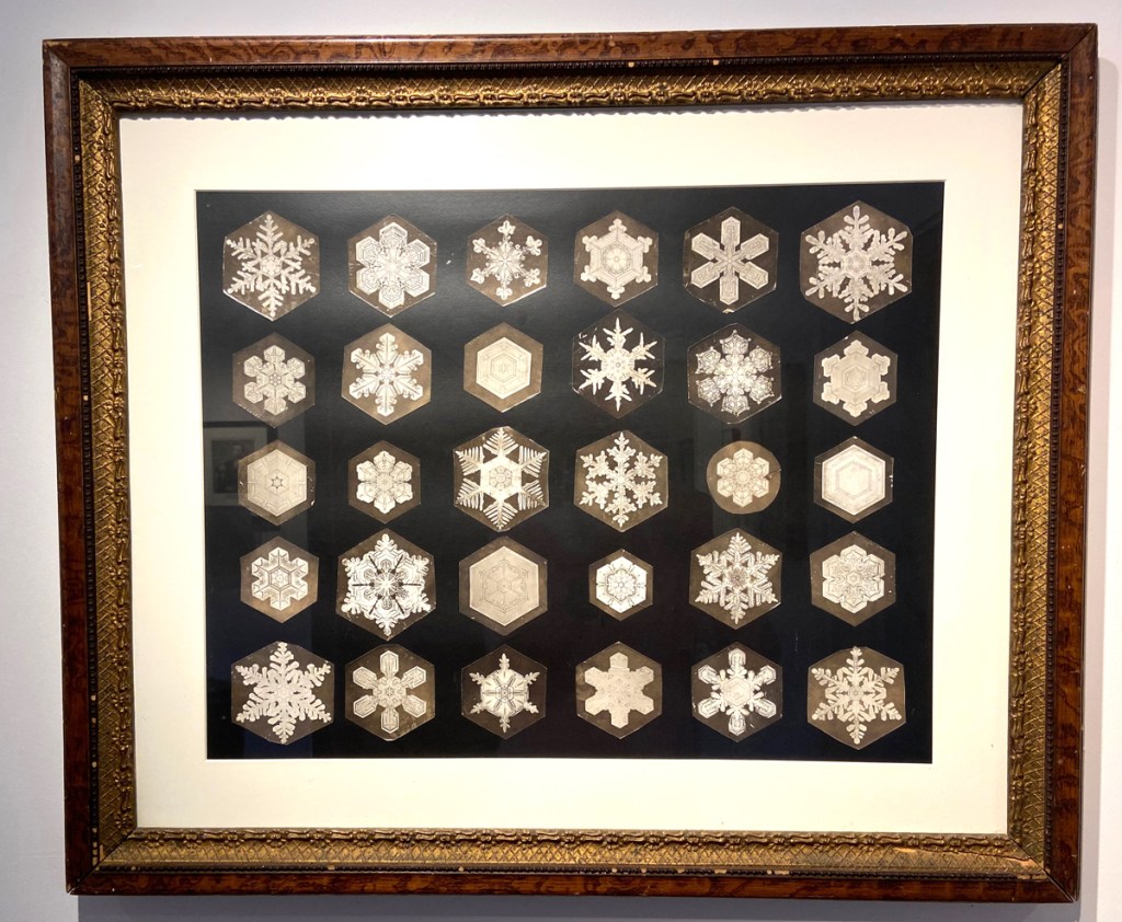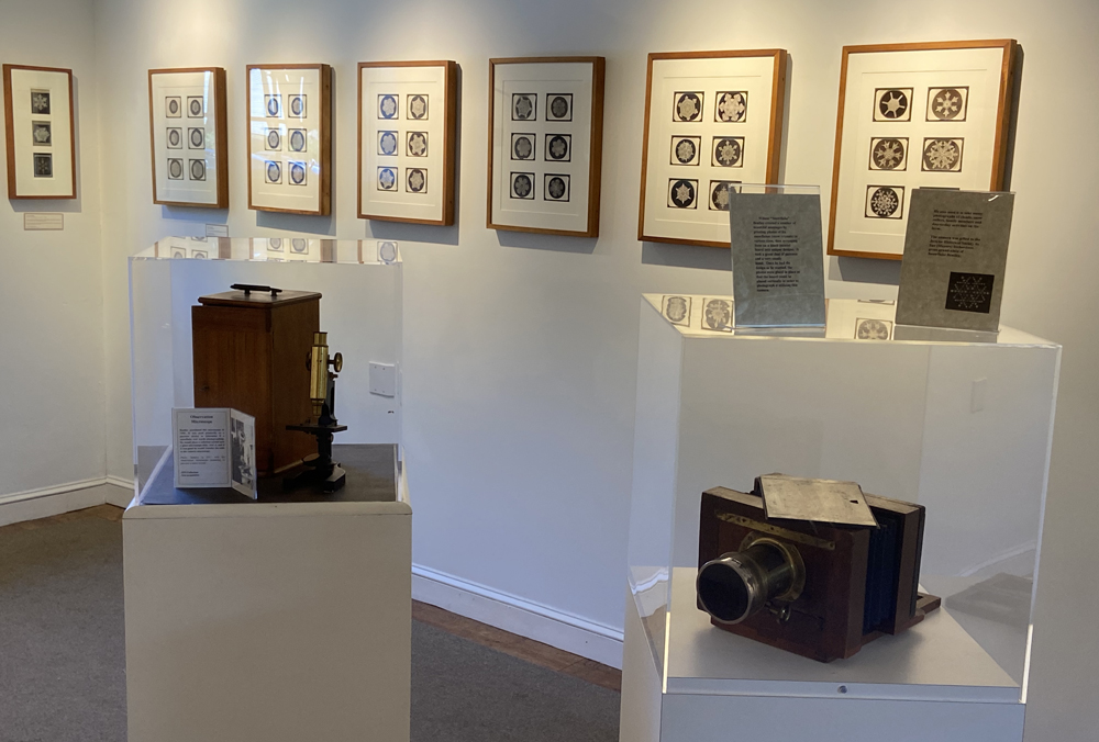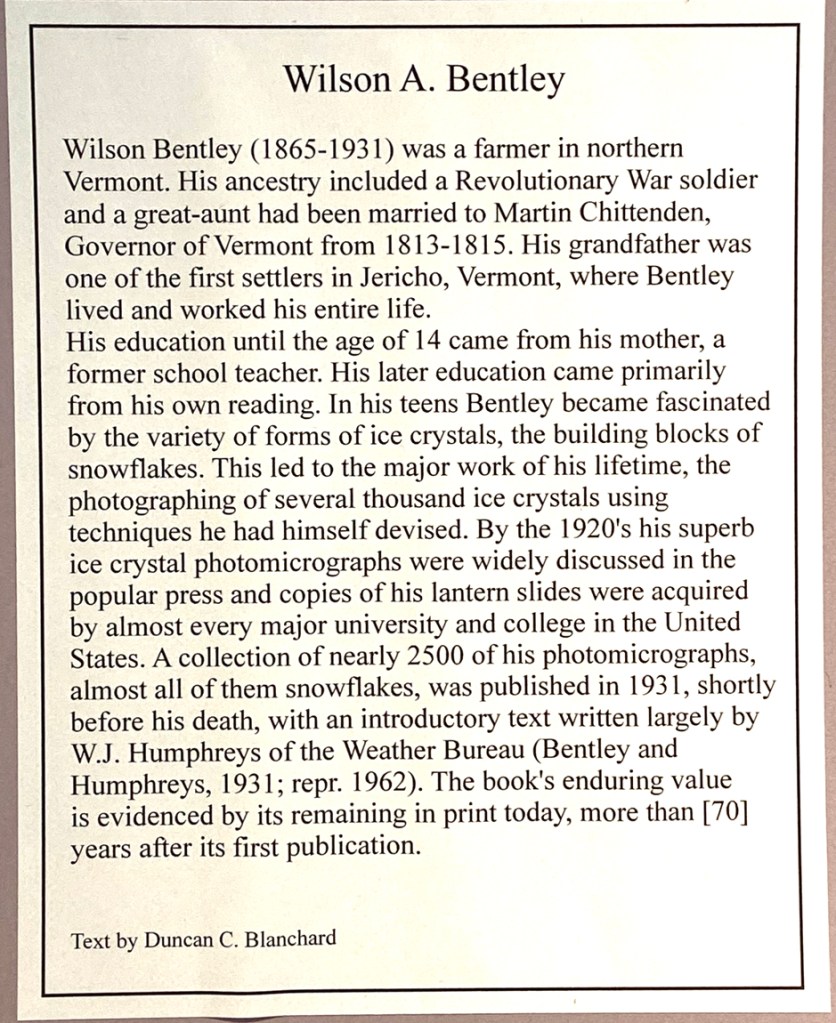 Housed here are the town offices, a craft shop, and a small historical society museum exhibit – important history that you need to know. You have heard that no two snowflakes are alike, but do you know why? Jericho’s Wilson A. Bentley at age 19 in 1885 was the first to capture a single snowflake on glass plate film. Developing his own equipment, he went on to photograph over 5,000 snowflakes, never finding two alike. His published studies are still “the Bible” on snowflakes. Below is the exhibit room as you enter.
