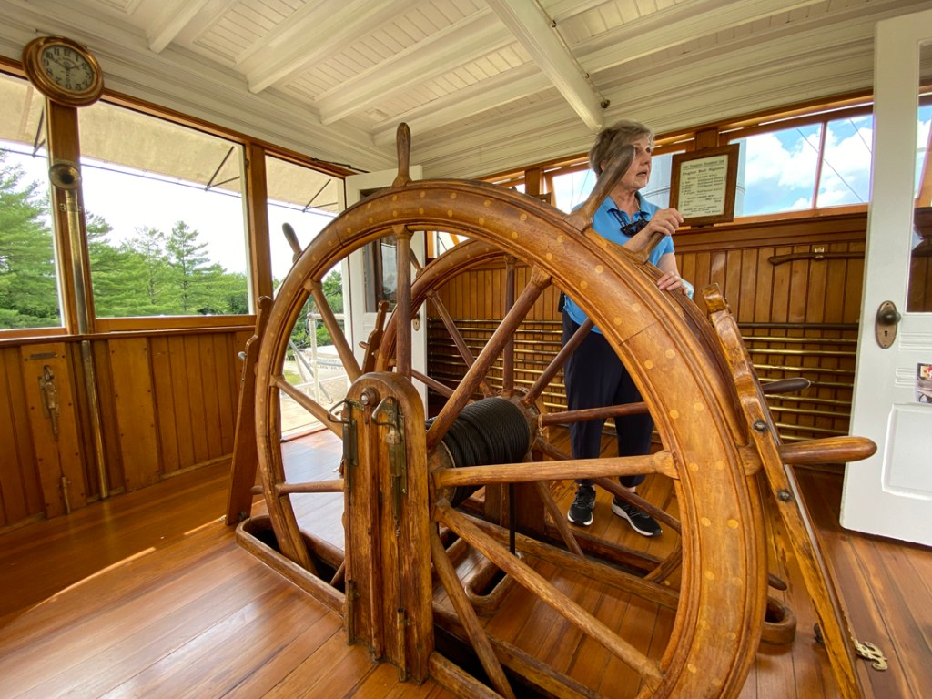 In the wheelhouse topside, Patty explained these large back-up wheels for steering. If the powered smaller wheel had a system failure, these two large manual wheels would be engaged, and two men on each wheel would turn the cables running to the rudder for steering – not an easy feat. Note the brass piping on the rear bulkhead – radiators with steam heat for the bitter Vermont winters on the lake.