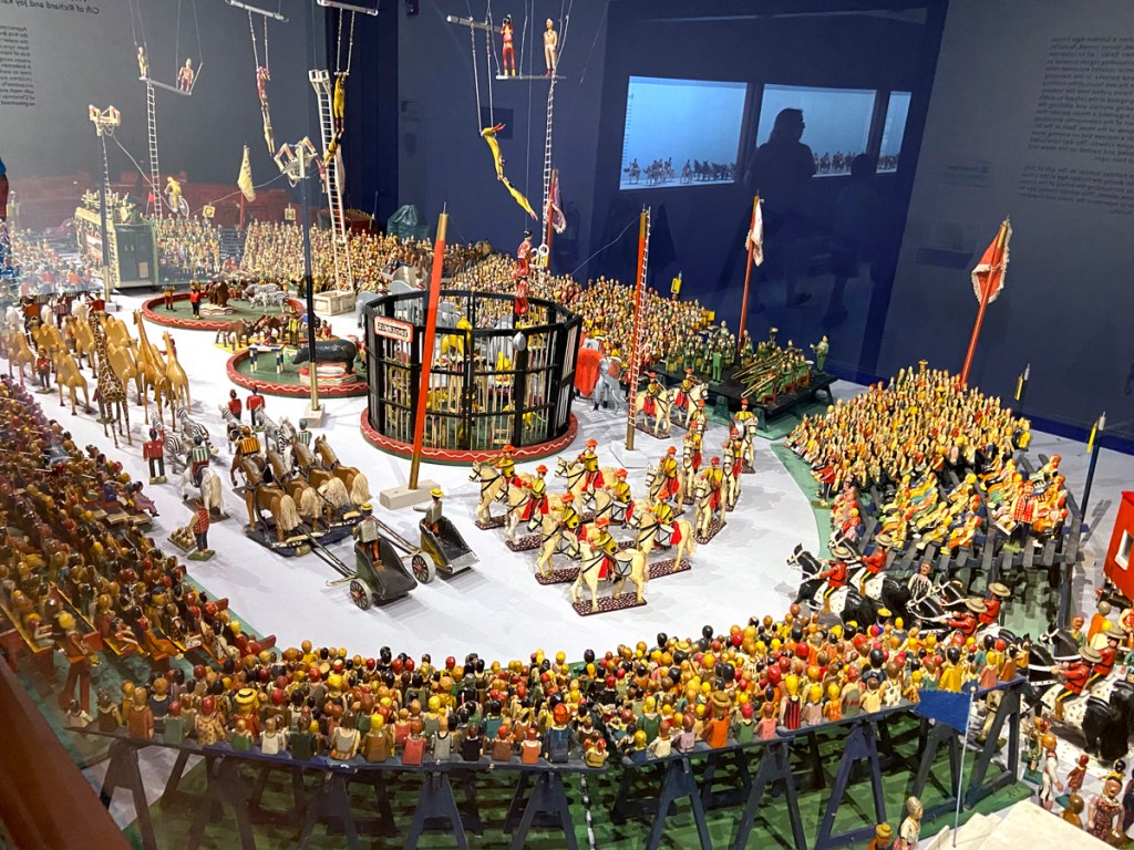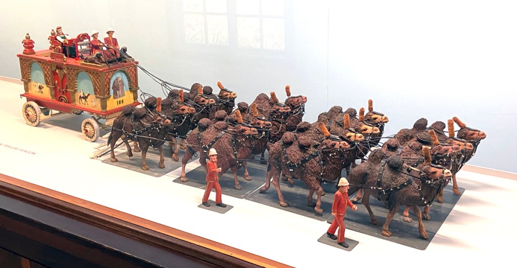 It was a hot day. On the way out we walked through the air-conditioned circus building (this was my Cathy’s favorite exhibit here) which in 518 feet has a carved circus parade extending almost that entire length. On the opposite wall are vintage posters and original carousel animals. Of course outside there is a real operating carousel.