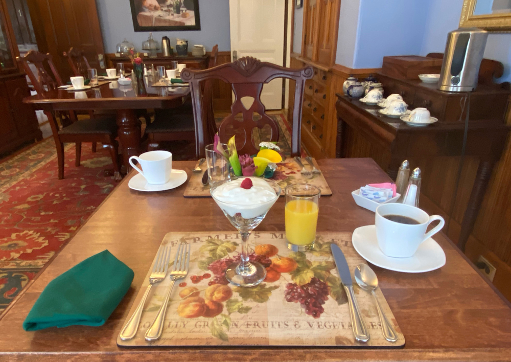 I really regret not having had my camera at breakfast Saturday morning, but here is Sunday morning. Dan’s meals, the presentation, and Tom’s adeptness at serving make me want to return — if only for breakfast. I sat in the corner of the dining room taking it all in. Breakfast starts with a fruit presentation followed by a main course – this morning a unique hash, and a poached egg on top. Dan’s family was in the restaurant business Tom told me.