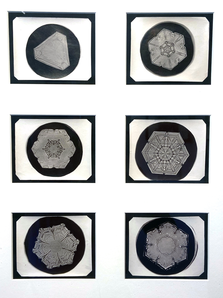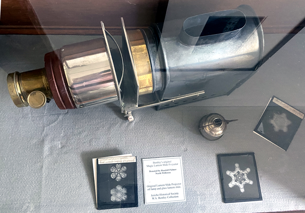 Housed here are the town offices, a craft shop, and a small historical society museum exhibit – important history that you need to know. You have heard that no two snowflakes are alike, but do you know why? Jericho’s Wilson A. Bentley at age 19 in 1885 was the first to capture a single snowflake on glass plate film. Developing his own equipment, he went on to photograph over 5,000 snowflakes, never finding two alike. His published studies are still “the Bible” on snowflakes. Below is the exhibit room as you enter.