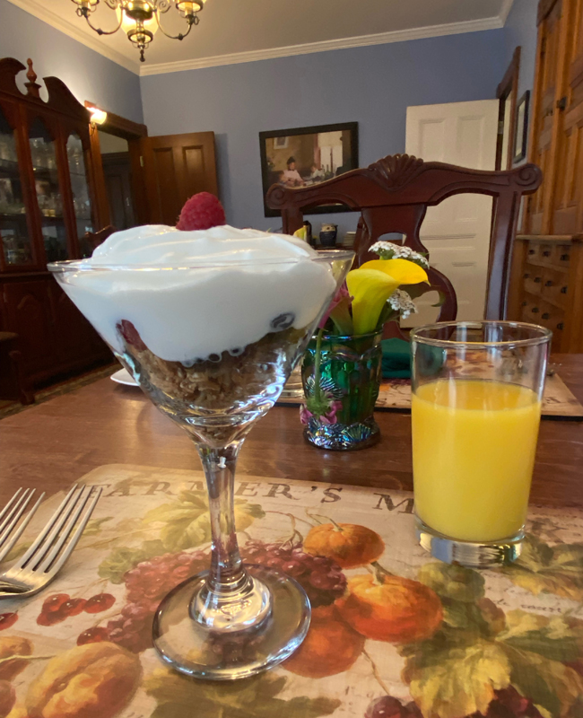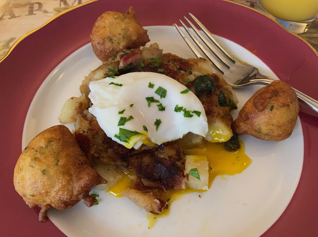 I really regret not having had my camera at breakfast Saturday morning, but here is Sunday morning. Dan’s meals, the presentation, and Tom’s adeptness at serving make me want to return — if only for breakfast. I sat in the corner of the dining room taking it all in. Breakfast starts with a fruit presentation followed by a main course – this morning a unique hash, and a poached egg on top. Dan’s family was in the restaurant business Tom told me.
