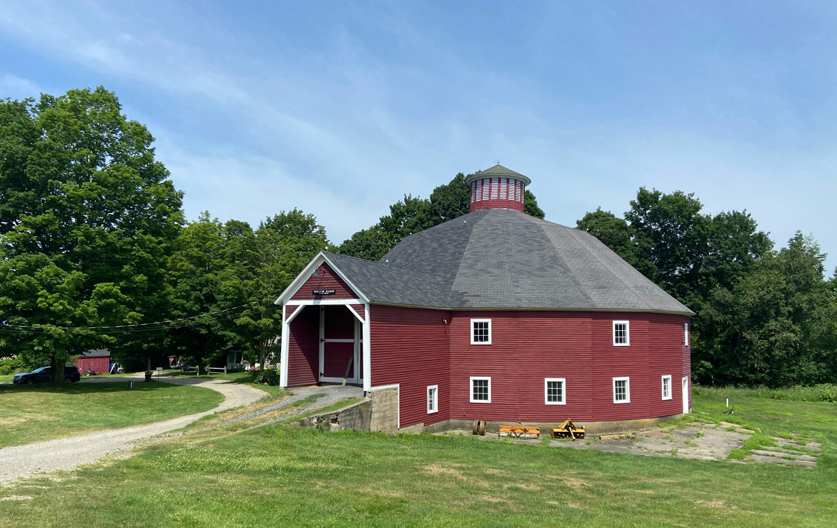 I could have easily headed south to I-89 or Route 2 to head towards Montpelier and Barre, but that is no fun when there are back roads I have not been on, and towns I have not seen. I traveled east on Vermont 15 which heads north for awhile up and around Smuggler’s Notch in the Stowe area. My plan was to then go south on Route 12 to Montpelier. Not much on Routes 15 and 12, but I have now been on these sections of road to report on. I saw a sign in Johnson for Ithiel Falls Camp Meeting, and went down a back road to see this camp founded in 1899. I have an affinity for church camp meeting grounds that provided much of the genesis for American vacations. In Morrsiville (per GPS in my phone camera) here is a wonderful round barn, built in 1916, complete with an interesting entrance and leaning round cupola, that I had to share.