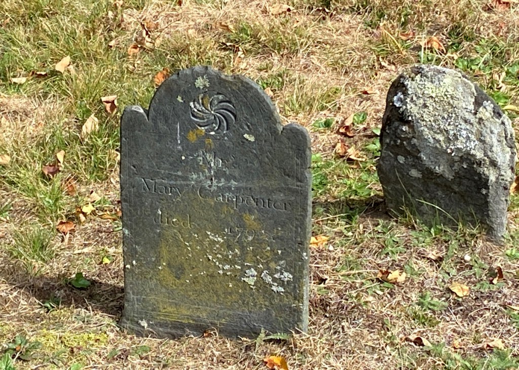 One always sees a large stone – the head stone – and assumes the head of the body is near that with the feet extended towards the viewer. Well, not so here with Mary Carpenter’s large head stone on the left, and the grave and body to its right ending with the foot stone.