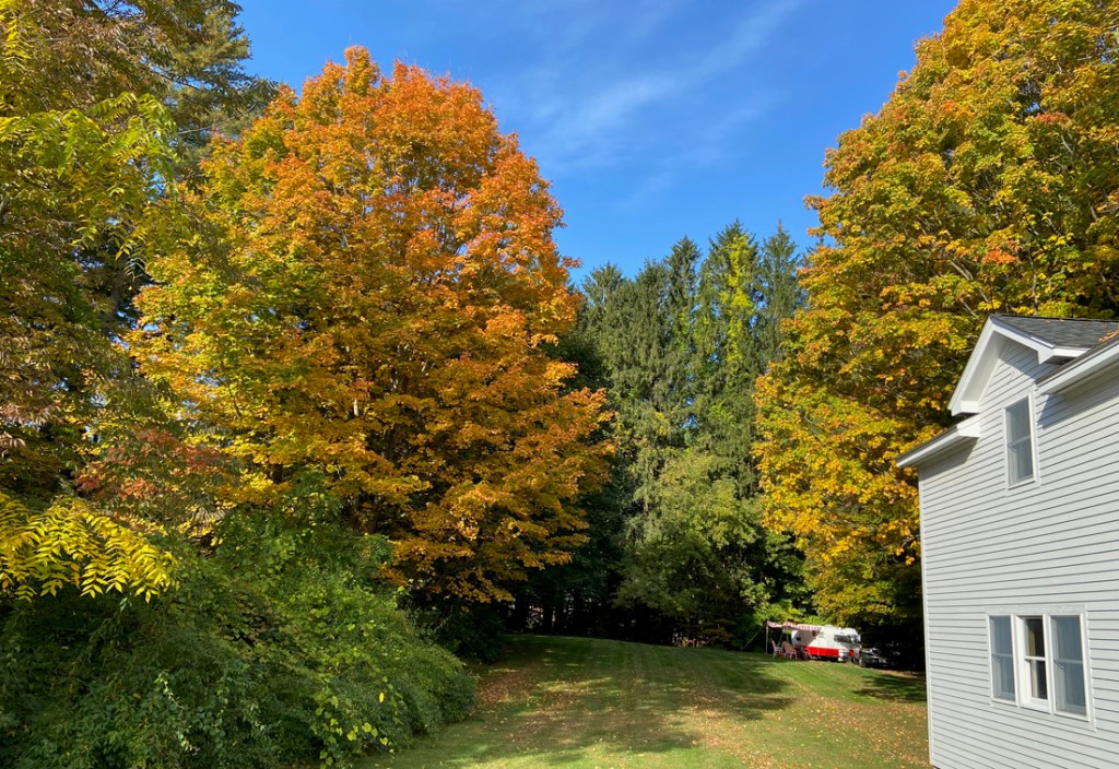 Giving equal coverage to be fair, here is the rear of “44” looking to “Camp 44” My maple on the left is never this early or this colorful – normally it is last and bland. This tree was but a few inches in diameter, and a few feet tall, growing out of an old stump when Cathy and I purchased “44” in 2002 – twenty years ago.
