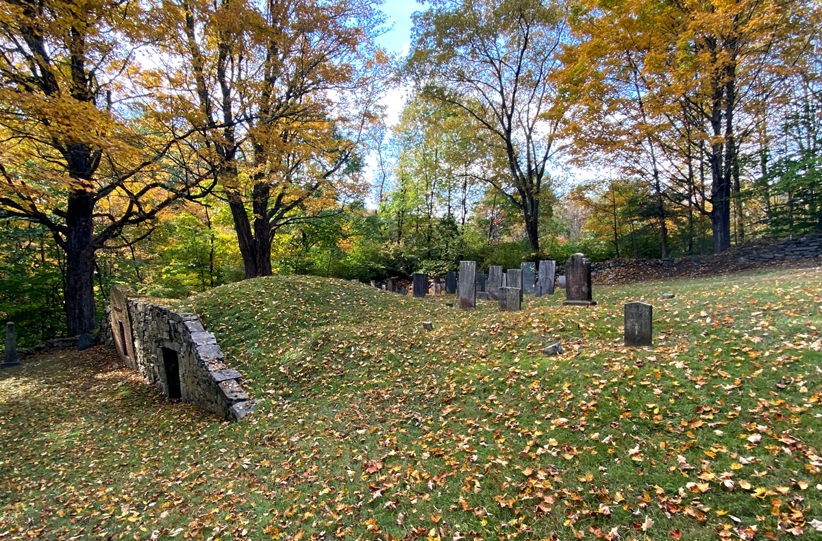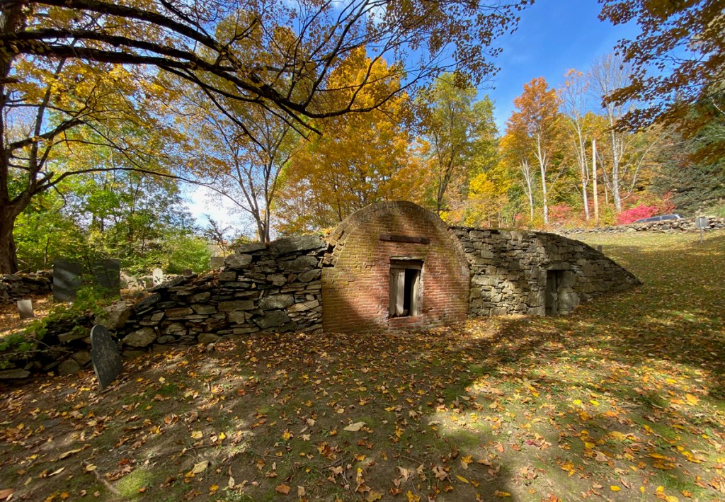 On the 12th I needed to find a cemetery in Westmoreland to find the tomb Capt. Abraham Roblin of New York City, was, in 1820, interred. Yes, I was working on my November history article – subject – HORATIO THE ELEPHANT feel free to click and read the story. Curious right? I found Pratt Cemetery on Route 63, but wondered why I have never seen it in the last 20 years passing by. Remember when in Guilford on 2 October we learned that early graveyards were built on hills and slopes that could not be used for farming or grazing? Well, the land that Rev. Pratt gave for a cemetery is a slope that drops sharply off from the road, below the stone wall, and you really have to be looking for it. I found it, and the Pratt tomb is the brick structure where Roblin was interred.