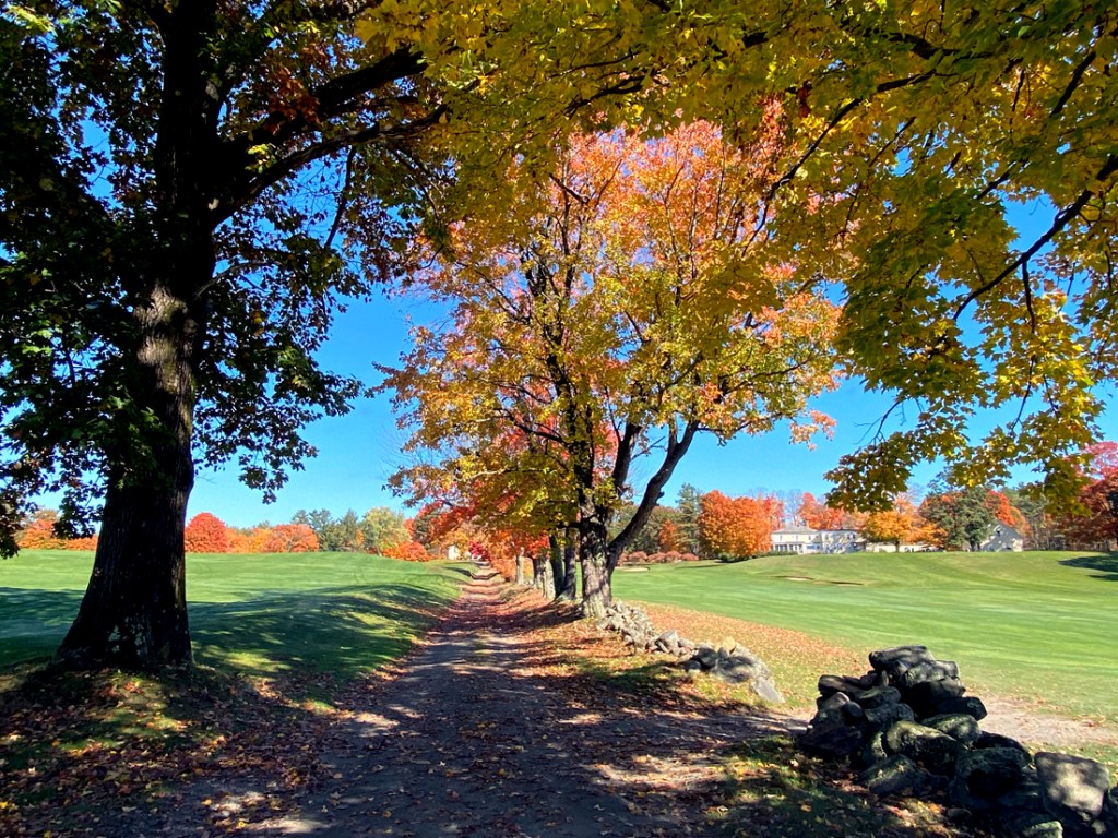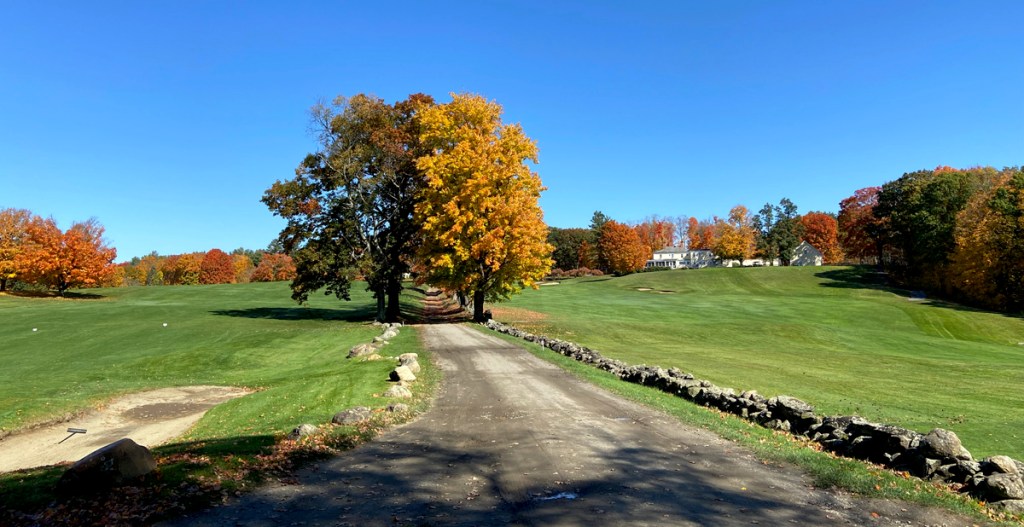 And, on the way home yesterday, 16 October, from my third COVID booster and flu shot, I needed to stop and explore behind the Hooper Institute in town for what I was just told could be remains of Walpole’s Town Pound. My October history article was on Town Pounds (click on this link for that story, which I hope you will enjoy) and I had to do some traipsing through the woods. But to get there, I went on a little known seasonal dirt road in Town – Meeting House Road – that goes through the golf course. And, here are some leafy views going up the hill.