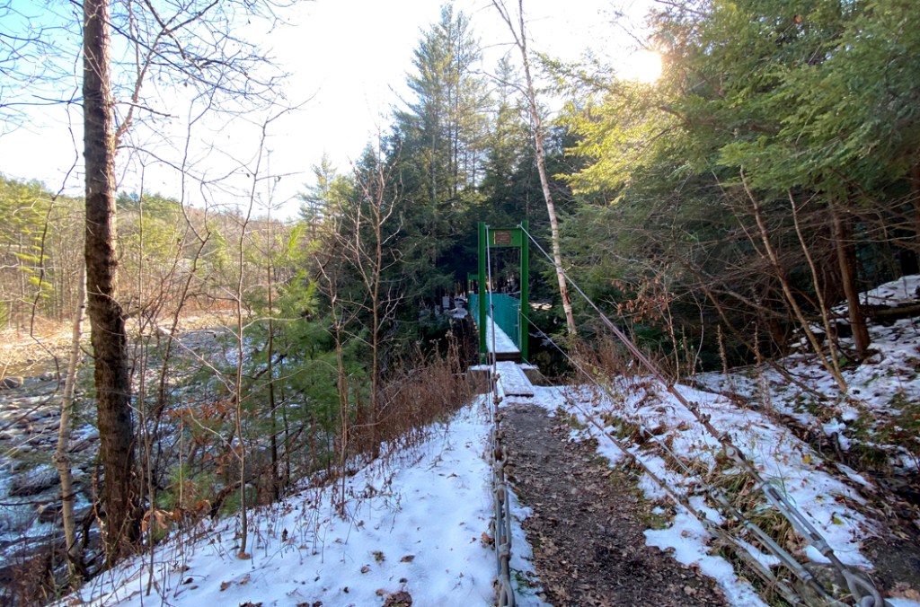 Continuing to Rutland, a careful examination on Google Maps had shown me more “new things.” A covered bridge and grist mill complex I did not know about, and just past the second crossing of the railroad tracks after Cuttingsville, to the left is the Clarendon Gorge Appalachian Trailhead (Long Trail) and the Bob Brugmann Suspension Bridge. I had to hike (safely walk) to see that.