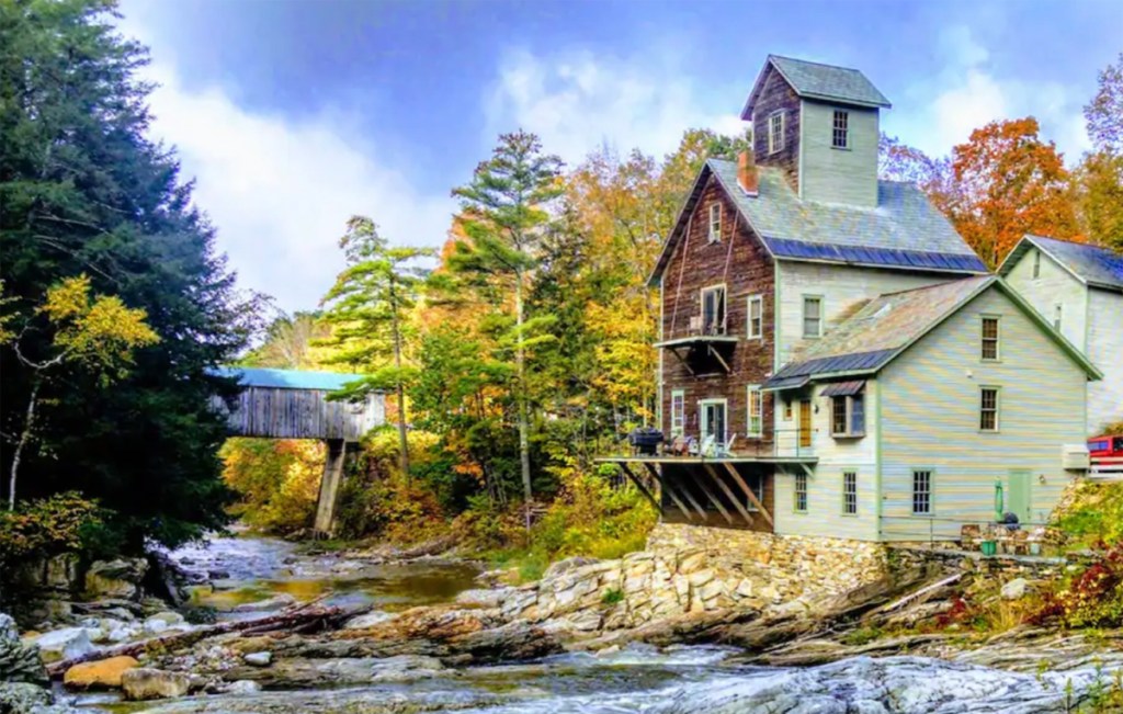 just before the bridge coming down the hill is the Grist Mill complex, but hard to get clear photos of. Turned into an Air BnB, I would love to stay there (since mills have been a fascination of mine, and my bookshop in Connecticut was in one). You may want to see interior views from their website, but here is an external painting on their site.