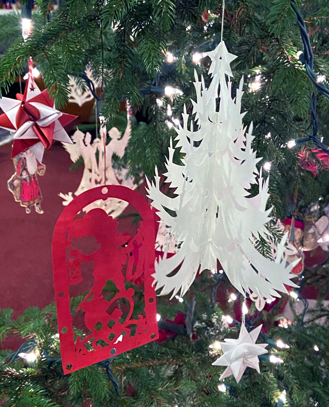 Here our treat was a sampling of their famous cheesecakes. Also with the overall Scandinavian theme, Innkeeper Lisa demonstrated the Scandinavian craft of Scherenschnitte, intricate paper cutting into intricate ornaments.