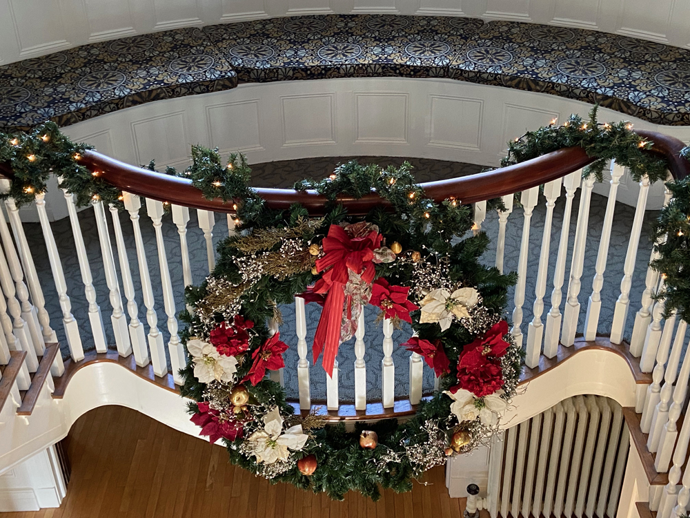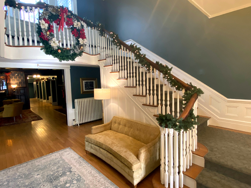The most attractive and historic building — and a must see. We would have concluded here, but as yet reopening with new owners they have yet to find a chef to be able to open the kitchen. Just one more COVID casualty. Also in talking with the hostess, there is no longer a reception desk, everything is done on-line: booking, code for access, QR code inside for information. I am “too old” for all these new changes, and just love to “talk to someone” – but will have to learn. My Cathy and I spent a New Year’s celebration here years ago. and my most fun visit was in 2018 for “Twas The Night Before Christmas” throughout the Inn. Do click on this link to enjoy those festivities. Also you may wish to look at our last Inndulgence Tour visit in 2019 for images of the tunnel to the telescope museum and telescope. We toured there again, but I did not take as many images. Below is the entryway.