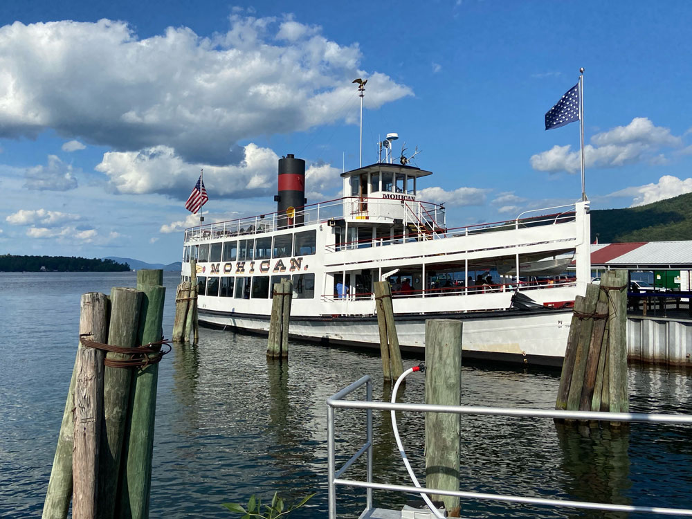 A forty minute drive west to Lake George, but not wanting to “miss the boat” at 10AM, Linda fed me a tad early, and I headed on NY 22 to US 4 to Route 9, and into Lake George, arriving at the Lake George Steamboat Company dock in plenty of time for my “six hour tour” (six, not three, and without Mary Ann) covering 32 miles – south to north and back – on the entire lake. Below the dock on Lake George.