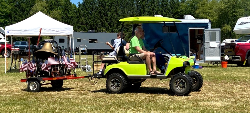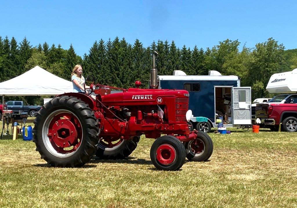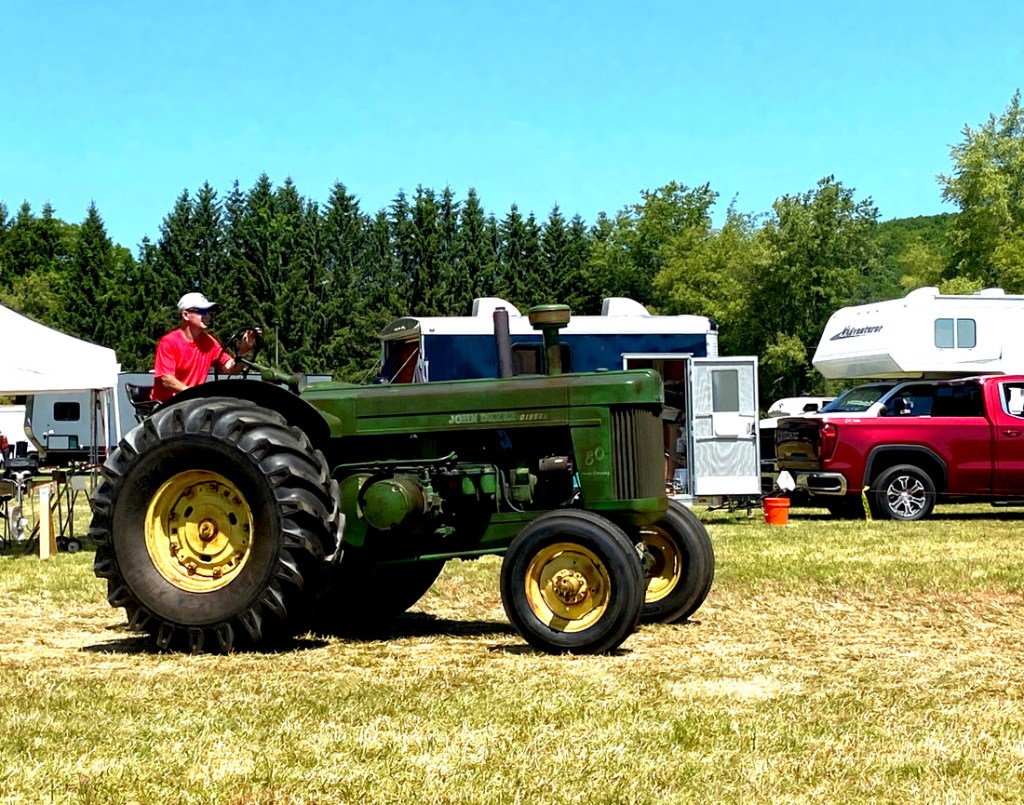 The show’s big day was yesterday, and I will share below why I did not go on Saturday, but I arrived today about 10:30 AM, and toured the flea market, without parting with a dime, and then sat under a tent. Soon it was announced the tractor parade would begin, and I was in the perfect spot near the commentator. Circling the field, arriving first was the UCC Church’s bell clanging to signal the parade. It is this church that has sponsored the event.