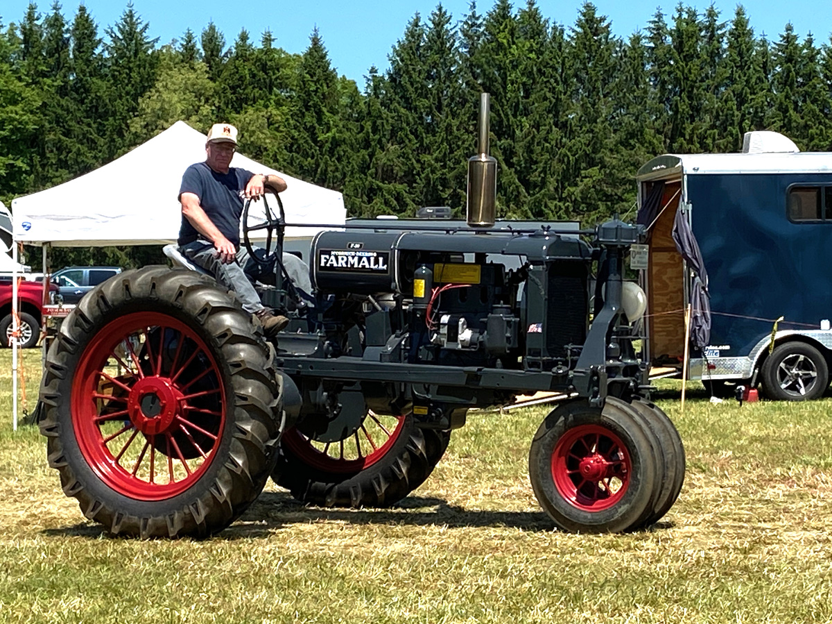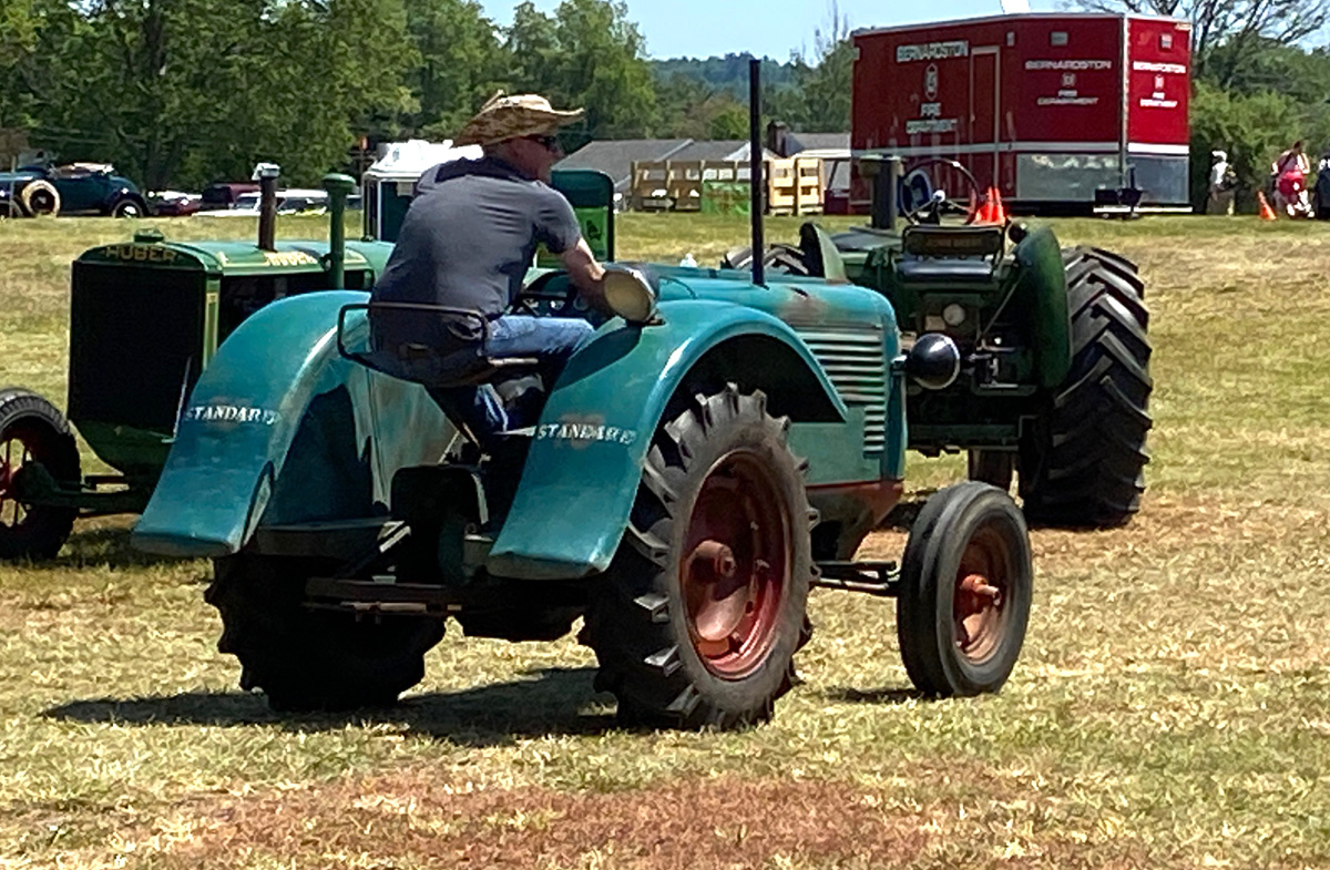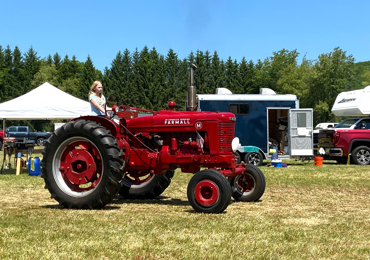 Not all tractors are the ubiquitous John Deere green. Here is a young lady driving a red Farmall (note the weights on the front wheels to hold it down when pulling a big load); followed by a nice early black tractor.