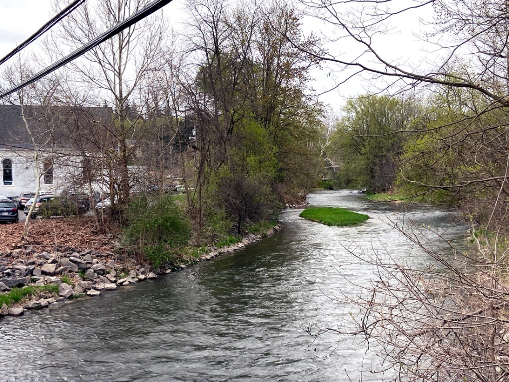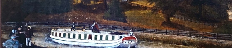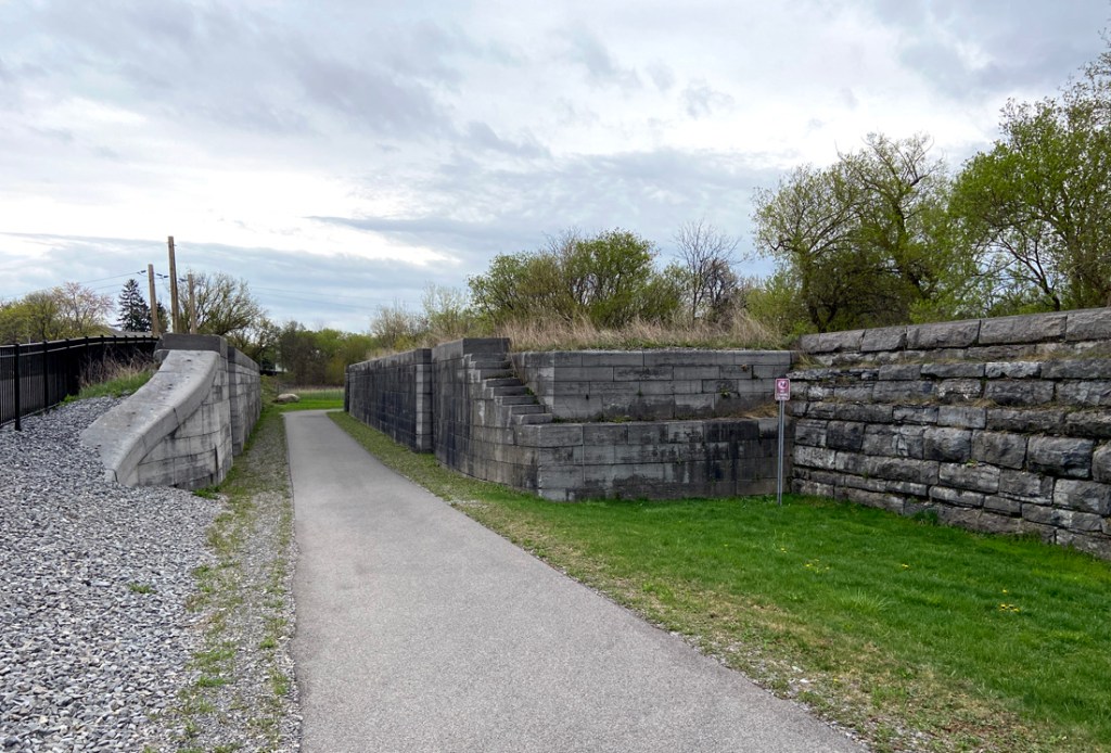 Looking east from the park, this is the enlarged canal from the 1850s, albeit blocked off. Efforts are underway to restore it for recreational use. The original canal was built to the south (to right of image) and into a hillside. When able to build into a hillside construction was only needed to one half of the excavation effort, building up on only one side – smart. Draining of canals in the winter kills plant life that if allowed to grow would clog the canals.