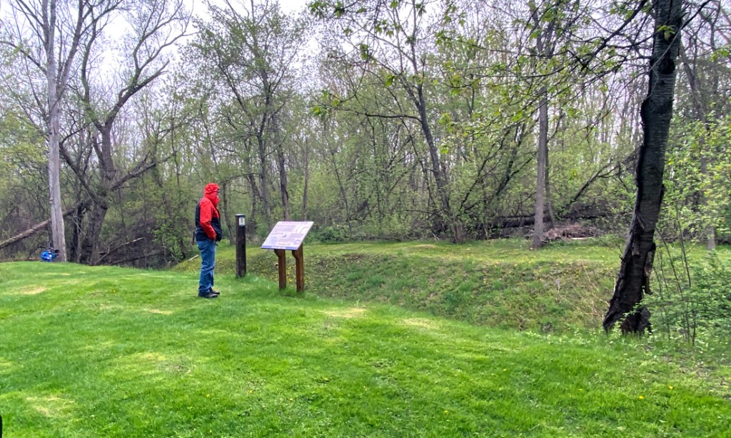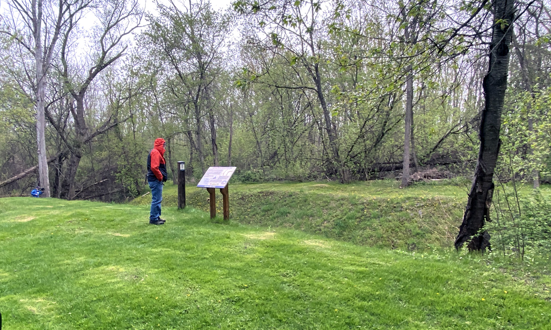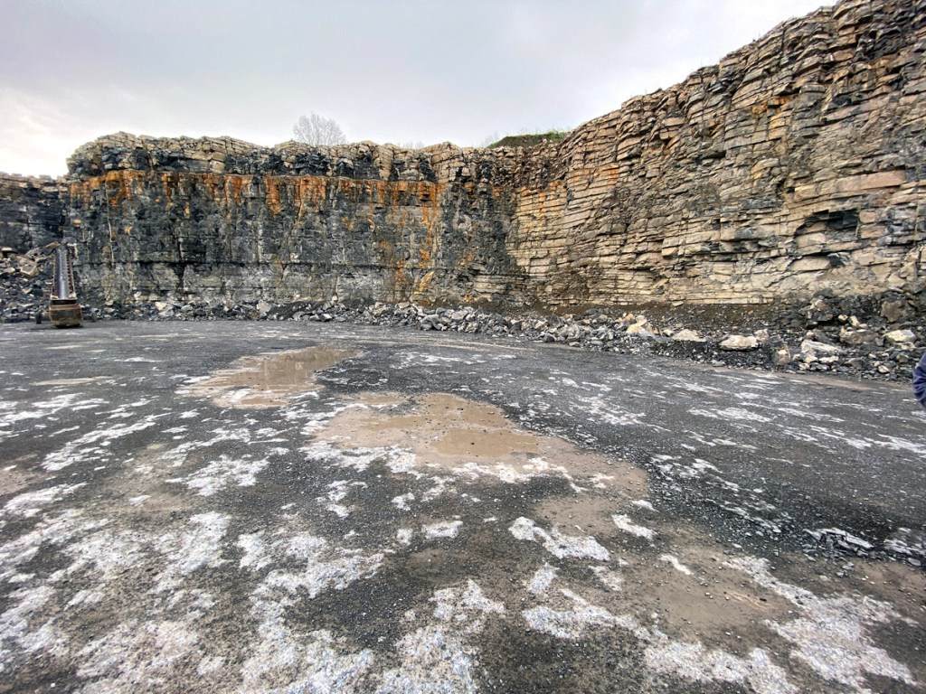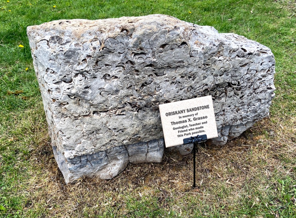 Monday, 24 April, was a full bus tour of Erie Canal sites in the Auburn and Port Byron area. We began at the Oakwood Quarry, opened in 1975. DeWitt Clinton explored this area while searching routes for the Erie Canal. Unique geology, and I want to learn more. Fossils abound – note the orange layer which is the result of ash buildup 390 million years ago – humbling and hard to comprehend.