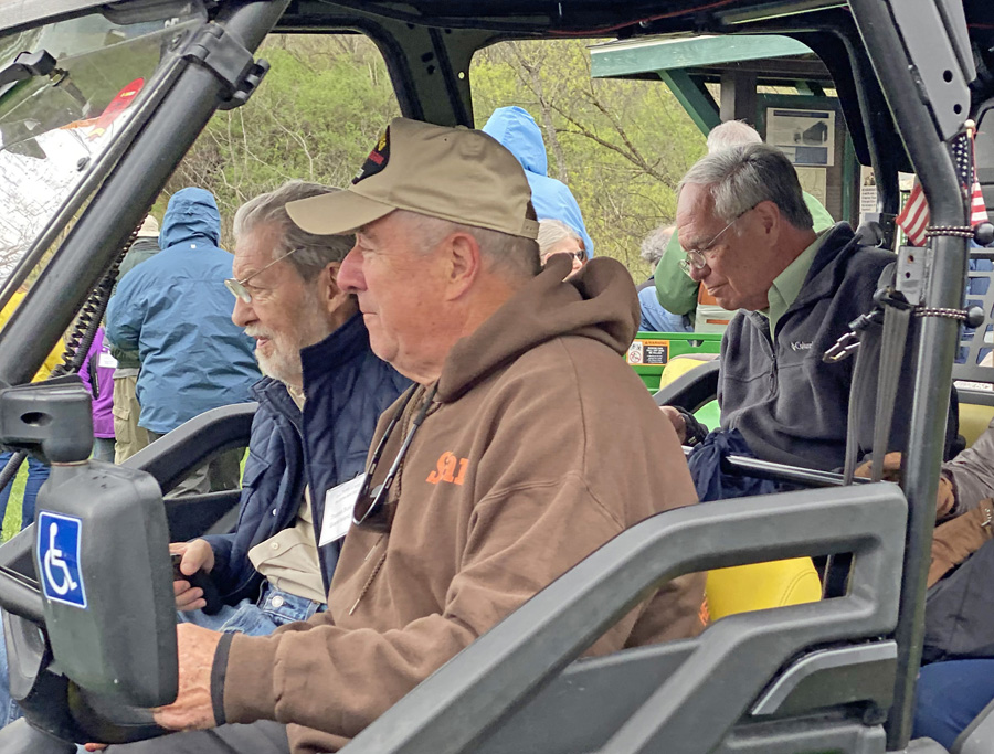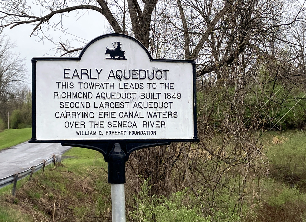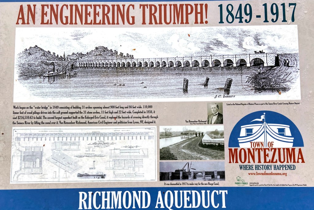 Next, the real highlight of the day – the Richmond Aqueduct over the Seneca River, and the original Clinton’s Ditch Lock 62 alongside the 1850s enlargement. We headed up to the entranceway for a hike down. There were golf carts, and with the leg pain I opted for a ride with my cane for rough ground. You may click on the sign to the left for a larger image.