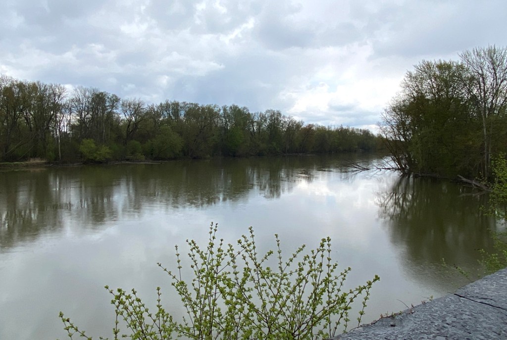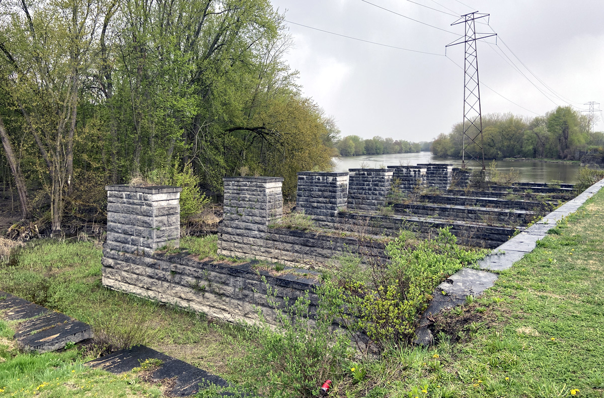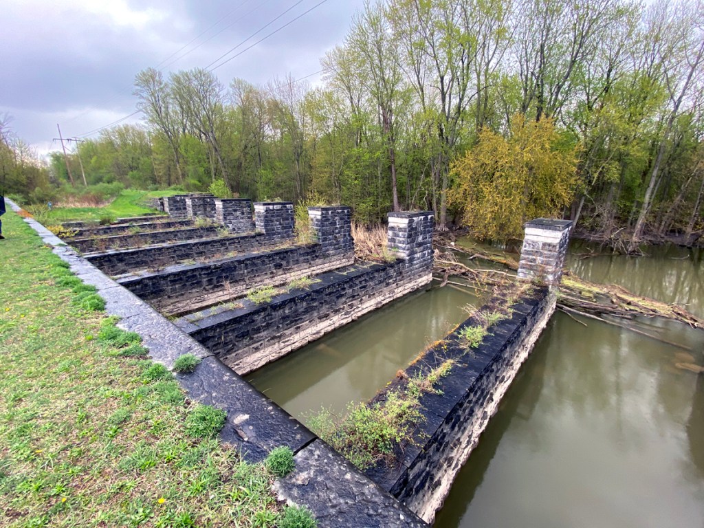 The site below of the lock on the original canal which emptied into the river. Canal boats then were pulled across the river to continue on in the original “ditch.” To correct that, the enlarged canal with the aqueduct was completed in 1856 becoming, “…one of the largest and most important structures on the Erie Canal.”