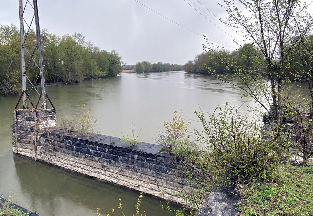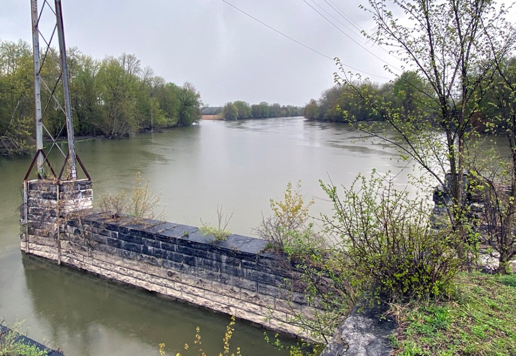 above and below you see the stone structure for the trough of the canal, and to the side the towpath which we could walk to the end. The structure complete across the river was removed ages ago for navigation.