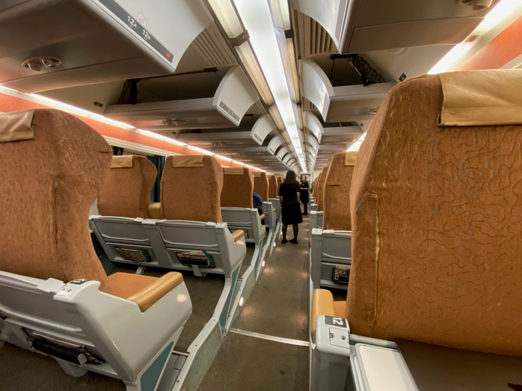 this time riding “economy class” since not meal time, and what should have been just under three hours. Seats smaller, tray table in armrest and smaller. but I did have the space to myself the whole way.