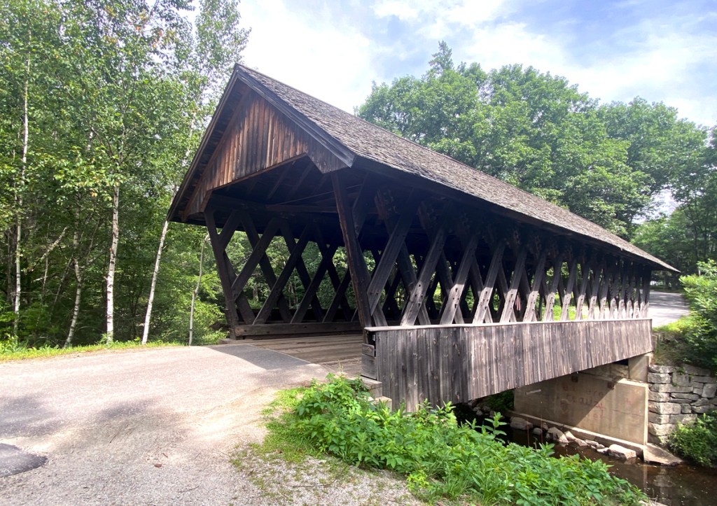 Cilleyville / Bog Bridge, built in 1887, this bridge spans Pleasant Brook. It was bypassed in 1959 and restricted to foot traffic (but now totally blocked off). The bridge was the model for murals of typical New Hampshire scenes which were once located in the State House in Concord. Style is town lattice truss, 53 feet long.