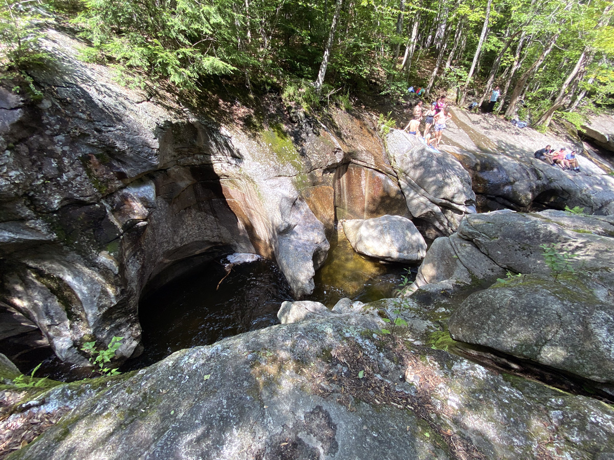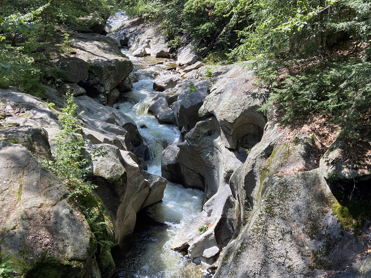 I arrived at Sculptured Rocks Natural Area in Groton. It is a 272-acre geology-oriented nature preserve featuring its namesake, the Sculptured Rocks, which are a series of narrow, sharply carved rock formations that are a popular local swimming hole. Worth a visit, but this balance challenged lad will not be found scrambling down and plunging into the water as you can see below some folks were doing.