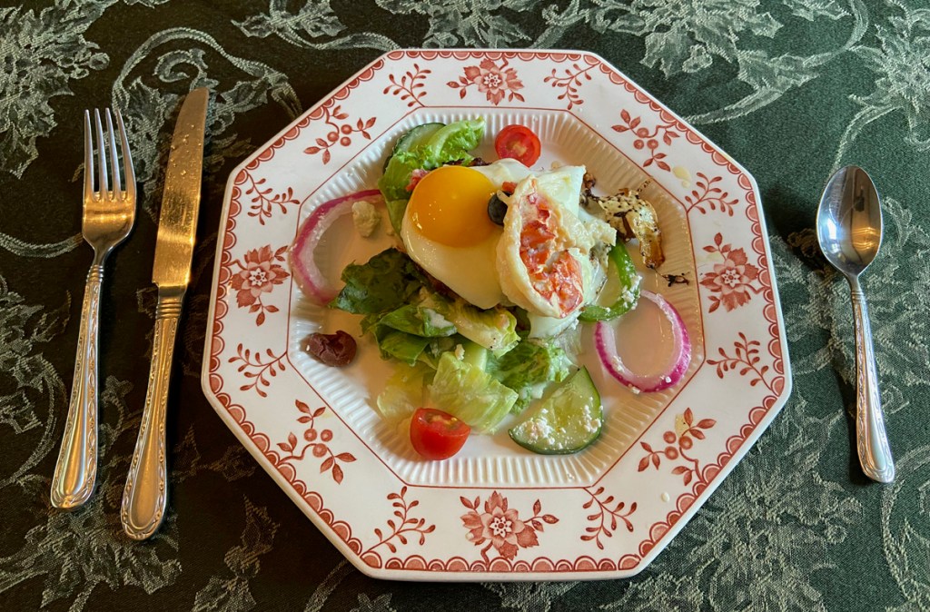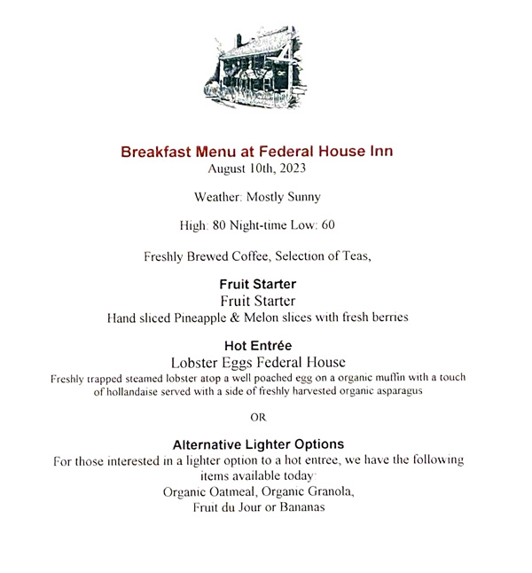In the evening I spent three hours in the library reflecting on the day, reading, and son, David, Face-Timed me. I visited with Kevin and another couple – such fun. How many times have you received an advance breakfast menu at a B&B? Never, I bet, I haven’t. Amazing breakfast, and worth the trip back. I think Kevin substituted a crab cake under the lobster for the muffin. Could be wrong, but think that is what he said.