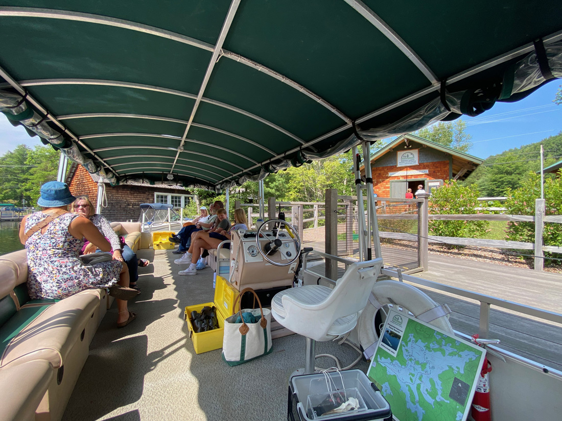 I am again “in love” – this time with Squam Lake. Think “On Golden Pond” – time to watch the movie again. The cruises are offered by the Squam Lakes Natural Science Center and I now “highly recommend” this outing. I will have to return to tour the center. I arrived about a half hour early, chatted with folks, and went to board. First below, looking down at the tour boat, and then back to the “office.”