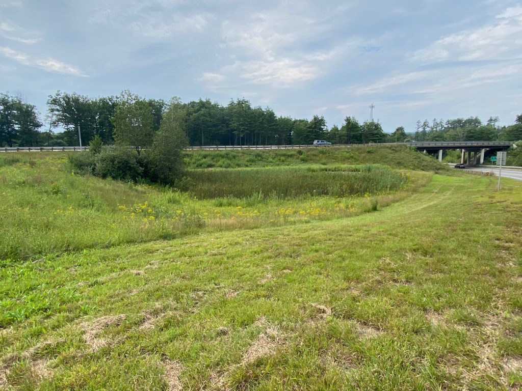 I explained my quest to Officer Harris. Happening long before she was probably on the force, the event did spark a memory, and she suggested where I look – just down the road in fact. She said if she found out otherwise she would be happy to call me. I gave her my phone number, but also email address – you know me “email person.” Well, below is the spot – Exit 19 northbound ramp off I-93. I was hoping there would be a plaque commemorating the importance of this man-made marsh; but, alas, there was not, nor any “wildlife” present. Here is the marsh.