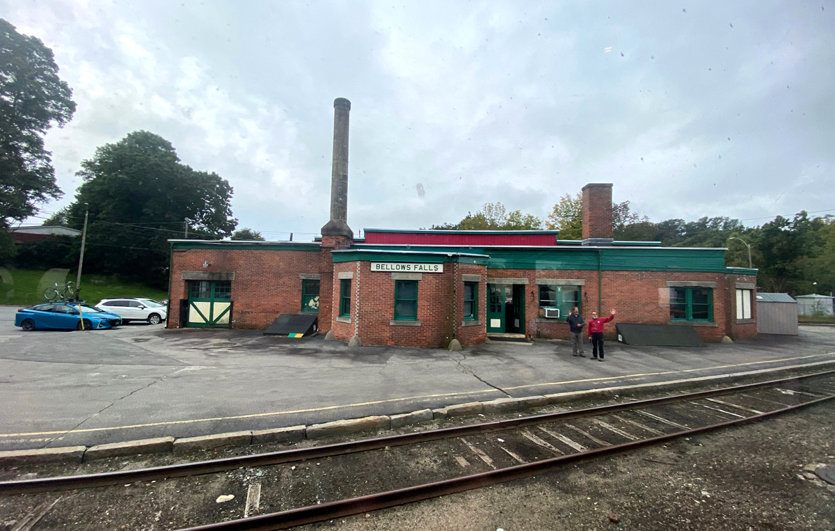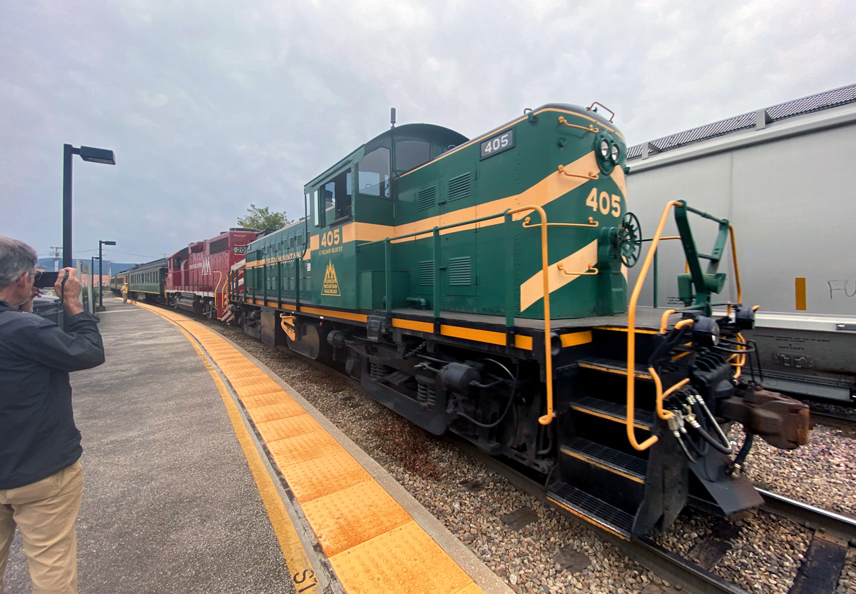 Train arriving at the Bellows Falls station (being purchased by the Town of Rockingham to be restored), and loading – note fog hiding some of Fall Mountain.