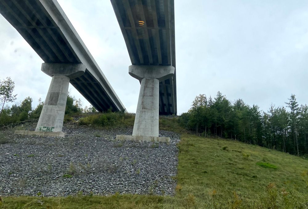 what a treat to travel along the railroad causeway in the Connecticut River – something that could never be built today. And then through the old rail yards that became home to Steamtown USA, and then back as rail yards. Heading north going under Route 5 as it turns and continues along the river, the tracks go under I-91.