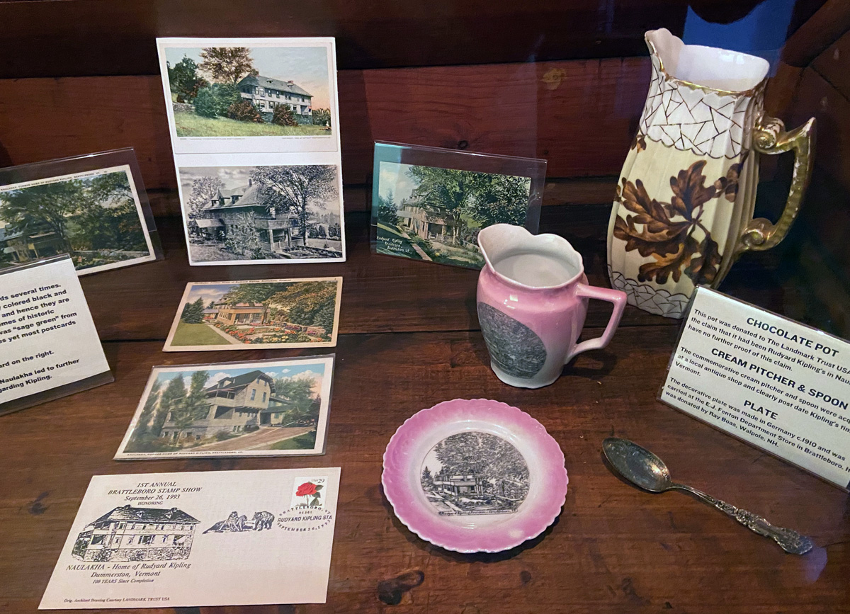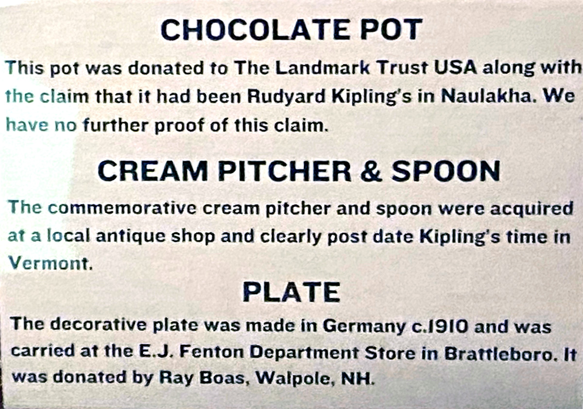 on the third floor of Naulakaha is a game room with a pool table, and a small library room with a showcase of mementos. Note the small round dish in the first image below (remember you can click my “galleries” for larger images). Then note the descriptive card in the next image. I purchased this small plate maybe a decade ago with a collection, and realized it belonged here, and donated it. Thank you, Jeremy, for noting my gift for posterity.