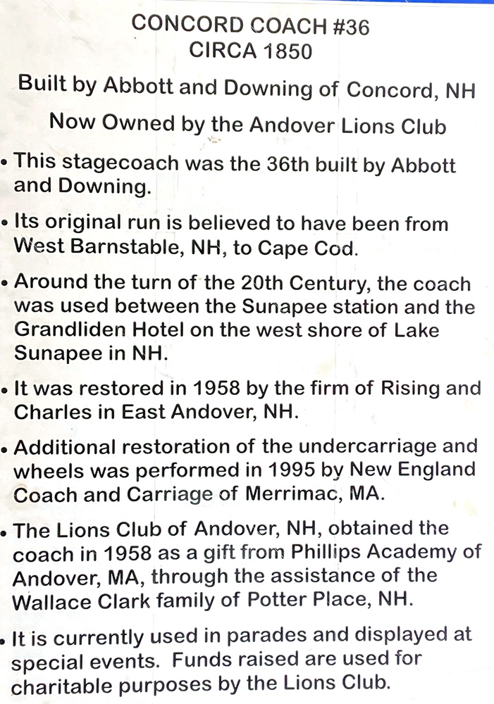 on display – but in a trailer – is this circa 1850 Concord Coach owned by the Andover Lions Club. Soon a permanent building may house this treasure.