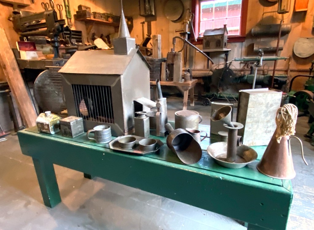 And the “tin shop.” You better remember I apprenticed at Old Sturbridge Village in the tin shop when I “Boarded with the Bixby’s.” In the image below on the left are two tin books, used as lunch pails – yes I have examples of. both. And to the left rear is a heater for rail car wheels – yes bought one last year. I have a ways to go, but what I saw here means I need to collect more – may even need another building. In the gallery below is the opposite side of the below, and some great hanging examples that I “now need.”