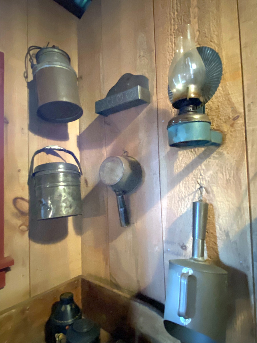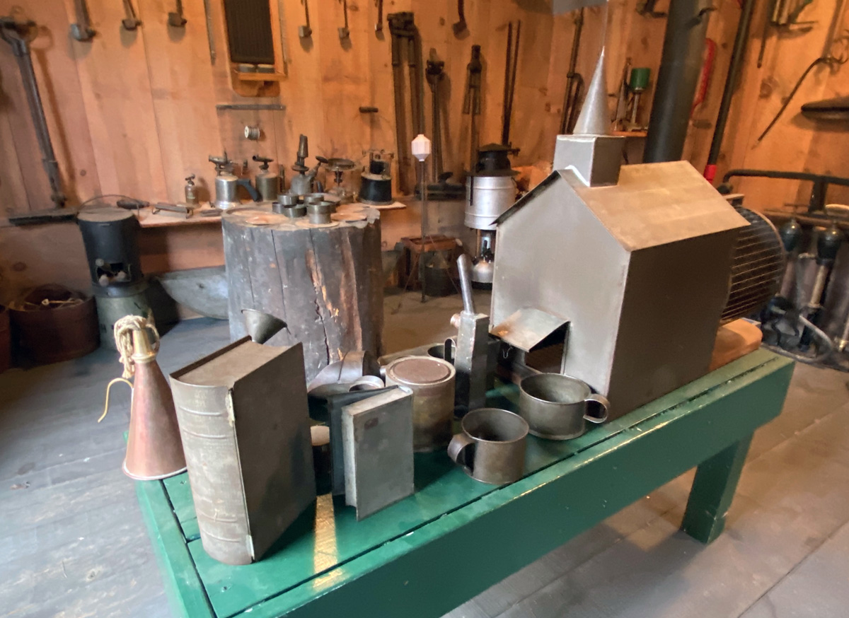 And the “tin shop.” You better remember I apprenticed at Old Sturbridge Village in the tin shop when I “Boarded with the Bixby’s.” In the image below on the left are two tin books, used as lunch pails – yes I have examples of. both. And to the left rear is a heater for rail car wheels – yes bought one last year. I have a ways to go, but what I saw here means I need to collect more – may even need another building. In the gallery below is the opposite side of the below, and some great hanging examples that I “now need.”