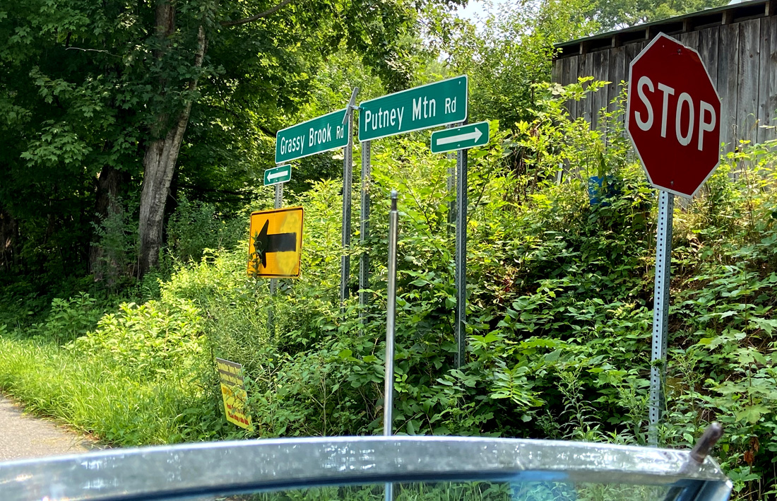 Putney Mountain Road ends at this intersection with Grassy Brook Road where it bends. Going straight onto Grassy Brook Road heads off to Brookline and Athens (VT that is). In June 2017, I shared with you THE ONLY ROUND SCHOOLHOUSE IN THE US which is on this route in Brookline. An interesting tale about this building you may wish to read – click the link above, and scroll down the post.