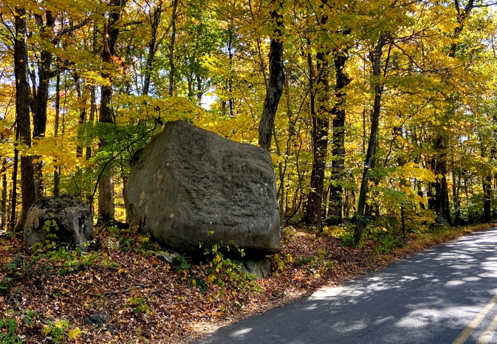 Driving north, Kent was packed with leaf-peepers, but I continued north towards Cornwall looking for a certain unmarked turn. Above you saw the farm house my grandfather, Ernest, bought in 1926. In 1927 his sister, Helene Yampolsky, bought remote property on a remote road. I remember as (guessing) a seven year old an exciting visit there, touring the house and outbuilding where Franz, Ernest and Helene’s father, had a study. The home had many, many items Franz brought back from his anthropological trips to British Columbia. I knew the road was somewhere near a fun Glacial Erratic, and there it was.