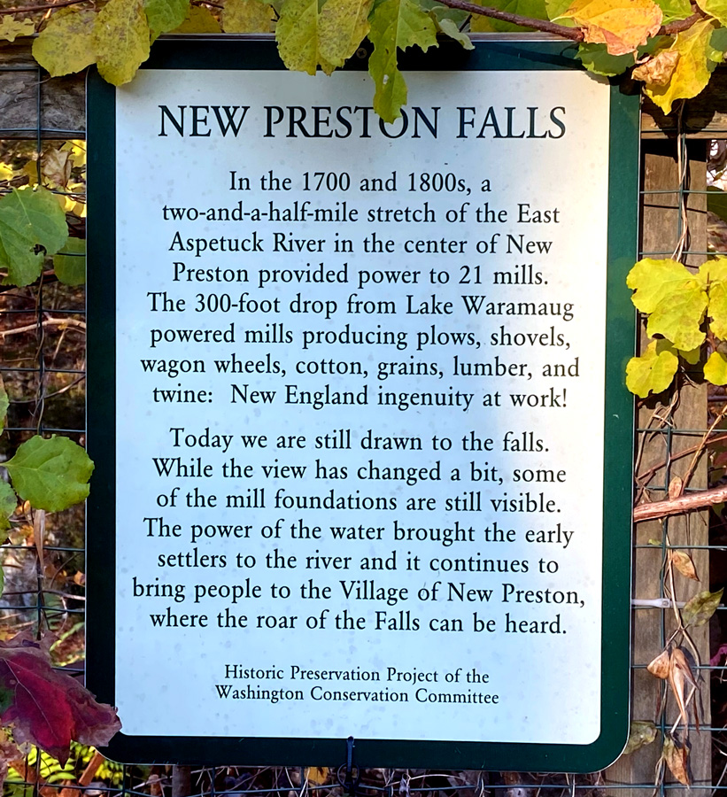 Cathy and I owned the waterfall and most of the “mill pond” the town owning the dam. Twenty-five years ago I recommended that the leaks in the dam be sealed using hydraulic cement as was used in the caissons building the Brooklyn Bridge. But, alas, what does a bookseller know about engineering, and no one listened to me, thus the current status below in the image on the right.