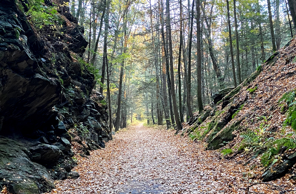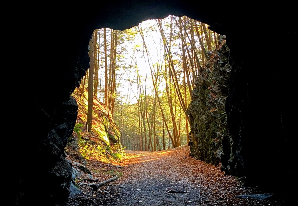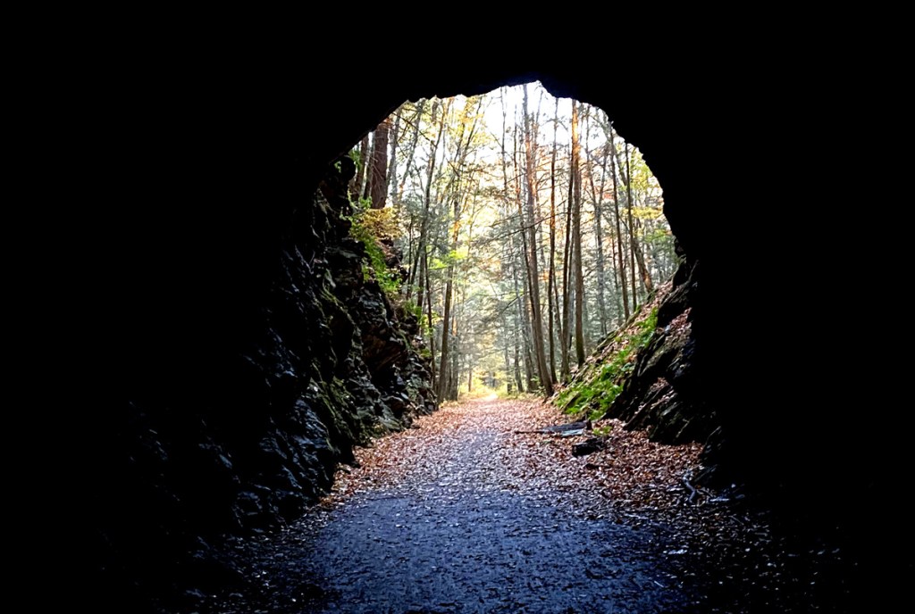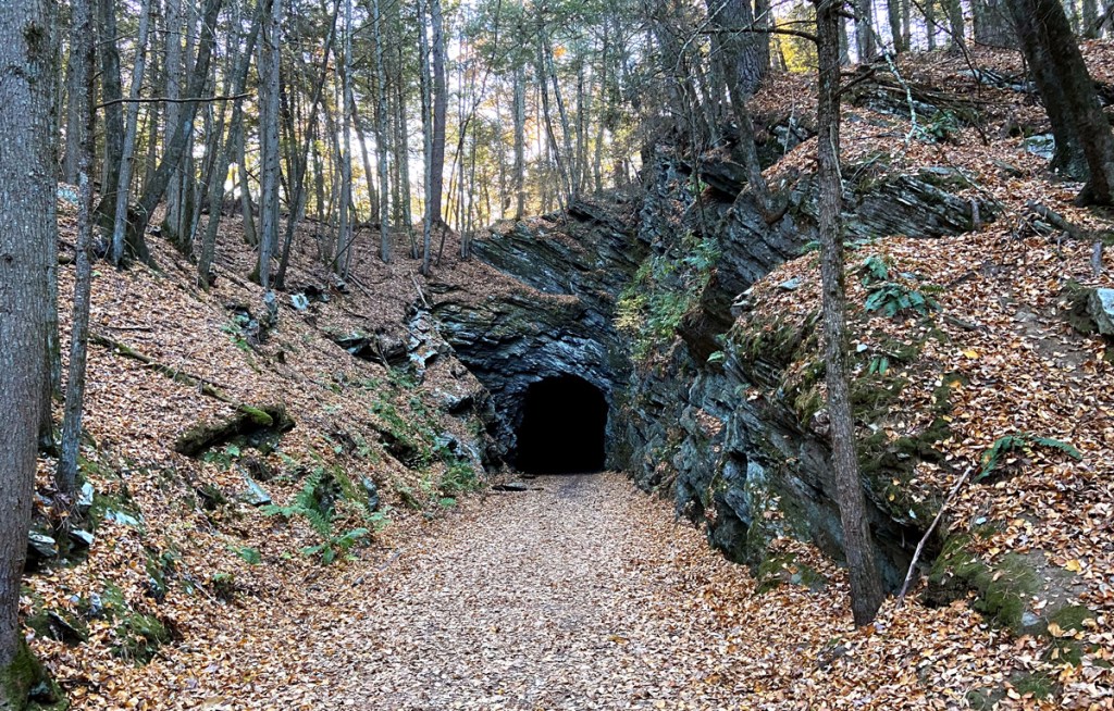 FINALLY – over 60 years later I carefully drove along the small dirt road along the Shepaug River (RAB highly recommends a trip) to a parking lot (well dead end with room for a few cars to park) I looked around and found a small sign high on a tree pointing TUNNEL Off I carefully hiked soon getting to the entrance – terrain a tad different 60 plus years later – remember I drove here before.