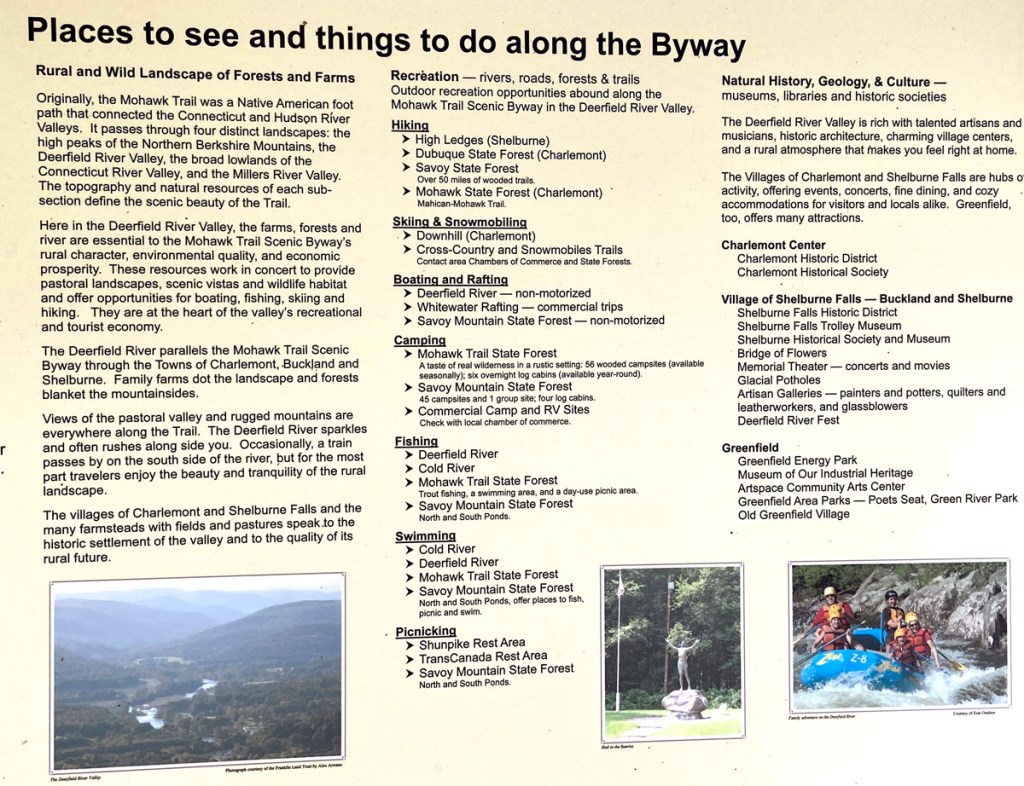 the “end game” of this overnight was to experience the 176th FRANKLIN COUNTY FAIR in Greenfield, Massachusetts, Instead of driving straight down to Greenfield and then home, it obviously makes sense to head west first for a mountain top overnight, and then pick up the Mohawk Trail (Route 2) and head back east to Greenfield. I always have to stop at the roadside area which displays the “shunpiking history” sign you see above in my masthead. Below is the cemetery there along the river. No history or names that I can share — need to research more. But following then are the panels which you may wish to click to enlarge and learn about the “trail” and the towns along the way.